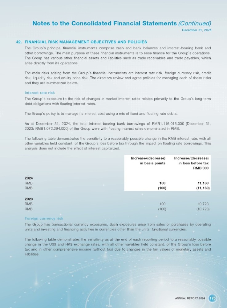 ANNUAL REPORT 2024 175 Notes to the Consolidated Financial Statements (Continued) December 31, 2024 42. FINANCIAL RISK MANAGEMENT OBJECTIVES AND POLICIES The Group ’ s principal financial instruments comprise cash and bank balances and interest - bearing bank and other borrowings . The main purpose of these financial instruments is to raise finance for the Group ’ s operations . The Group has various other financial assets and liabilities such as trade receivables and trade payables, which arise directly from its operations . The main risks arising from the Group ’ s financial instruments are interest rate risk, foreign currency risk, credit risk, liquidity risk and equity price risk . The directors review and agree policies for managing each of these risks and they are summarized below . Interest rate risk The Group ’ s exposure to the risk of changes in market interest rates relates primarily to the Group ’ s long - term debt obligations with floating interest rates . The Group ’ s policy is to manage its interest cost using a mix of fixed and floating rate debts . As at December 31 , 2024 , the total interest - bearing bank borrowings of RMB 1 , 116 , 015 , 000 (December 31 , 2023 : RMB 1 , 072 , 294 , 000 ) of the Group were with floating interest rates denominated in RMB . The following table demonstrates the sensitivity to a reasonably possible change in the RMB interest rate, with all other variables held constant, of the Group ’ s loss before tax through the impact on floating rate borrowings . This analysis does not include the effect of interest capitalized . Increase/(decrease) in loss before tax RMB ’ 000 Increase/(decrease) in basis points 2024 11,160 100 RMB (11,160) (100) RMB 2023 10,723 100 RMB (10,723) (100) RMB Foreign currency risk The Group has transactional currency exposures . Such exposures arise from sales or purchases by operating units and investing and financing activities in currencies other than the units ’ functional currencies . The following table demonstrates the sensitivity as at the end of each reporting period to a reasonably possible change in the US $ and HK $ exchange rates, with all other variables held constant, of the Group ’ s loss before tax and in other comprehensive income (without tax) due to changes in the fair values of monetary assets and liabilities .