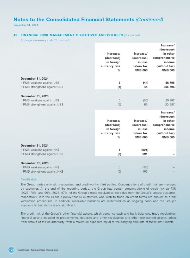 Ascentage Pharma Group International 176 Notes to the Consolidated Financial Statements (Continued) December 31, 2024 42. FINANCIAL RISK MANAGEMENT OBJECTIVES AND POLICIES (Continued) Foreign currency risk (Continued) Increase/ (decrease) in other comprehensive income (without tax) RMB ’ 000 Increase/ (decrease) in loss before tax RMB ’ 000 Increase/ (decrease) in foreign currency rate % December 31, 2024 56,796 (44) 5 If RMB weakens against US$ (56,796) 44 (5) If RMB strengthens against US$ December 31, 2023 20,987 (65) 5 If RMB weakens against US$ (20,987) 65 (5) If RMB strengthens against US$ Increase/ (decrease) in other comprehensive income (without tax) RMB ’ 000 Increase/ (decrease) in loss before tax RMB ’ 000 Increase/ (decrease) in foreign currency rate % December 31, 2024 – (691) 5 If RMB weakens against HK$ – 691 (5) If RMB strengthens against HK$ December 31, 2023 – (165) 5 If RMB weakens against HK$ – 165 (5) If RMB strengthens against HK$ Credit risk The Group trades only with recognized and creditworthy third parties . Concentrations of credit risk are managed by customer . At the end of the reporting period, the Group had certain concentrations of credit risk as 73 % ( 2023 : 78 % ) and 96 % ( 2023 : 97 % ) of the Group ’ s trade receivables were due from the Group ’ s largest customer, respectively . It is the Group ’ s policy that all customers who wish to trade on credit terms are subject to credit verification procedures . In addition, receivable balances are monitored on an ongoing basis and the Group ’ s exposure to bad debts is not significant . The credit risk of the Group ’ s other financial assets, which comprise cash and bank balances, trade receivables, financial assets included in prepayments, deposits and other receivables and other non - current assets, arises from default of the counterparty, with a maximum exposure equal to the carrying amounts of these instruments .