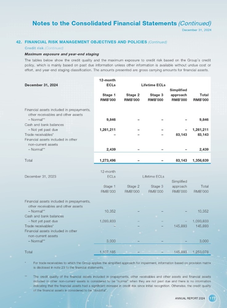 ANNUAL REPORT 2024 177 Notes to the Consolidated Financial Statements (Continued) December 31, 2024 42. FINANCIAL RISK MANAGEMENT OBJECTIVES AND POLICIES (Continued) Credit risk (Continued) Maximum exposure and year - end staging The tables below show the credit quality and the maximum exposure to credit risk based on the Group ’ s credit policy, which is mainly based on past due information unless other information is available without undue cost or effort, and year - end staging classification . The amounts presented are gross carrying amounts for financial assets . December 31, 2024 Financial assets included in prepayments, other receivables and other assets – Normal** Cash and bank balances – Not yet past due Trade receivables* Financial assets included in other non - current assets – Normal** Total 12 - month Lifetime ECLs ECLs Simplified Total approach Stage 3 Stage 2 Stage 1 RMB ’ 000 RMB ’ 000 RMB ’ 000 RMB ’ 000 RMB ’ 000 9,846 – – – 9,846 1,261,211 – – – 1,261,211 83,143 83,143 – – – 2,439 – – – 2,439 1,356,639 83,143 – – 1,273,496 December 31, 2023 Total Simplified approach Lifetime ECLs Stage 3 Stage 2 12 - month ECLs Stage 1 RMB ’ 000 RMB ’ 000 RMB ’ 000 RMB ’ 000 RMB ’ 000 10,352 – – – 10,352 1,093,833 – – – 1,093,833 145,893 145,893 – – – 3,000 – – – 3,000 1,253,078 145,893 – – 1,107,185 Financial assets included in prepayments, other receivables and other assets – Normal** Cash and bank balances – Not yet past due Trade receivables* Financial assets included in other non - current assets – Normal** Total * For trade receivables to which the Group applies the simplified approach for impairment, information based on provision matrix is disclosed in note 23 to the financial statements . ** The credit quality of the financial assets included in prepayments, other receivables and other assets and financial assets included in other non - current assets is considered to be “ normal ” when they are not past due and there is no information indicating that the financial assets had a significant increase in credit risk since initial recognition . Otherwise, the credit quality of the financial assets is considered to be “ doubtful ” .