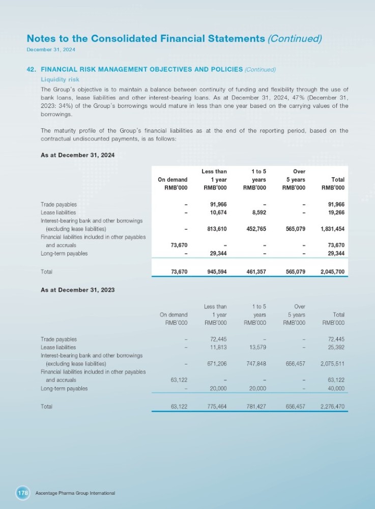 Ascentage Pharma Group International 178 Notes to the Consolidated Financial Statements (Continued) December 31, 2024 42. FINANCIAL RISK MANAGEMENT OBJECTIVES AND POLICIES (Continued) Liquidity risk The Group ’ s objective is to maintain a balance between continuity of funding and flexibility through the use of bank loans, lease liabilities and other interest - bearing loans . As at December 31 , 2024 , 47 % (December 31 , 2023 : 34 % ) of the Group ’ s borrowings would mature in less than one year based on the carrying values of the borrowings . The maturity profile of the Group ’ s financial liabilities as at the end of the reporting period, based on the contractual undiscounted payments, is as follows : As at December 31 , 2024 Interest - bearing bank and other borrowings Financial liabilities included in other payables Over 1 to 5 Less than Total 5 years years 1 year On demand RMB ’ 000 RMB ’ 000 RMB ’ 000 RMB ’ 000 RMB ’ 000 91,966 – – 91,966 – Trade payables 19,266 – 8,592 10,674 – Lease liabilities 1,831,454 565,079 452,765 813,610 – (excluding lease liabilities) 73,670 – – – 73,670 and accruals 29,344 – – 29,344 – Long - term payables 2,045,700 565,079 461,357 945,594 73,670 Total As at December 31, 2023 Over 1 to 5 Less than Total RMB ’ 000 5 years RMB ’ 000 years RMB ’ 000 1 year RMB ’ 000 On demand RMB ’ 000 72,445 – – 72,445 – Trade payables 25,392 – 13,579 11,813 – Lease liabilities Interest - bearing bank and other borrowings 2,075,511 656,457 747,848 671,206 – (excluding lease liabilities) Financial liabilities included in other payables 63,122 – – – 63,122 and accruals 40,000 – 20,000 20,000 – Long - term payables 2,276,470 656,457 781,427 775,464 63,122 Total