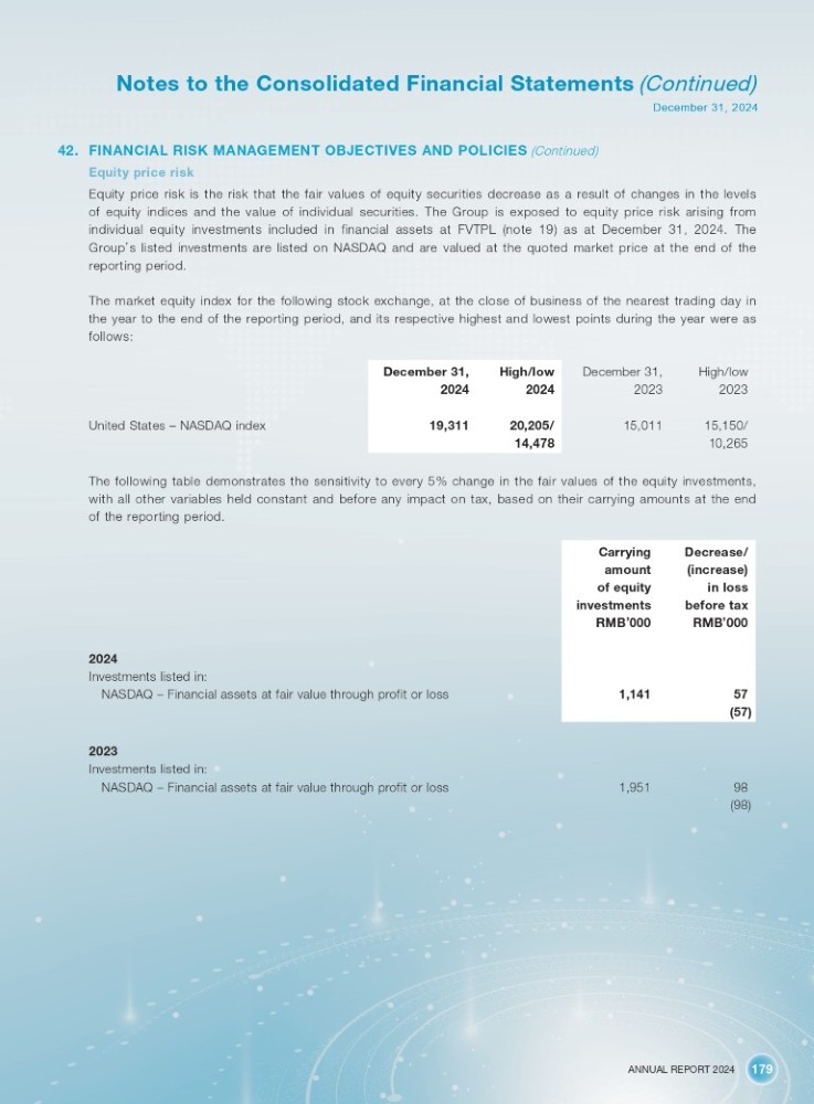 ANNUAL REPORT 2024 179 Notes to the Consolidated Financial Statements (Continued) December 31, 2024 42. FINANCIAL RISK MANAGEMENT OBJECTIVES AND POLICIES (Continued) Equity price risk Equity price risk is the risk that the fair values of equity securities decrease as a result of changes in the levels of equity indices and the value of individual securities . The Group is exposed to equity price risk arising from individual equity investments included in financial assets at FVTPL (note 19 ) as at December 31 , 2024 . The Group ’ s listed investments are listed on NASDAQ and are valued at the quoted market price at the end of the reporting period . The market equity index for the following stock exchange, at the close of business of the nearest trading day in the year to the end of the reporting period, and its respective highest and lowest points during the year were as follows : United States – NASDAQ index High/low December 31, High/low December 31, 2023 2023 2024 2024 15,150/ 15,011 20,205/ 19,311 10,265 14,478 The following table demonstrates the sensitivity to every 5 % change in the fair values of the equity investments, with all other variables held constant and before any impact on tax, based on their carrying amounts at the end of the reporting period . Decrease/ (increase) in loss before tax Carrying amount of equity investments RMB ’ 000 RMB ’ 000 57 1,141 2024 Investments listed in: NASDAQ – Financial assets at fair value through profit or loss (57) 98 1,951 2023 Investments listed in: NASDAQ – Financial assets at fair value through profit or loss (98)