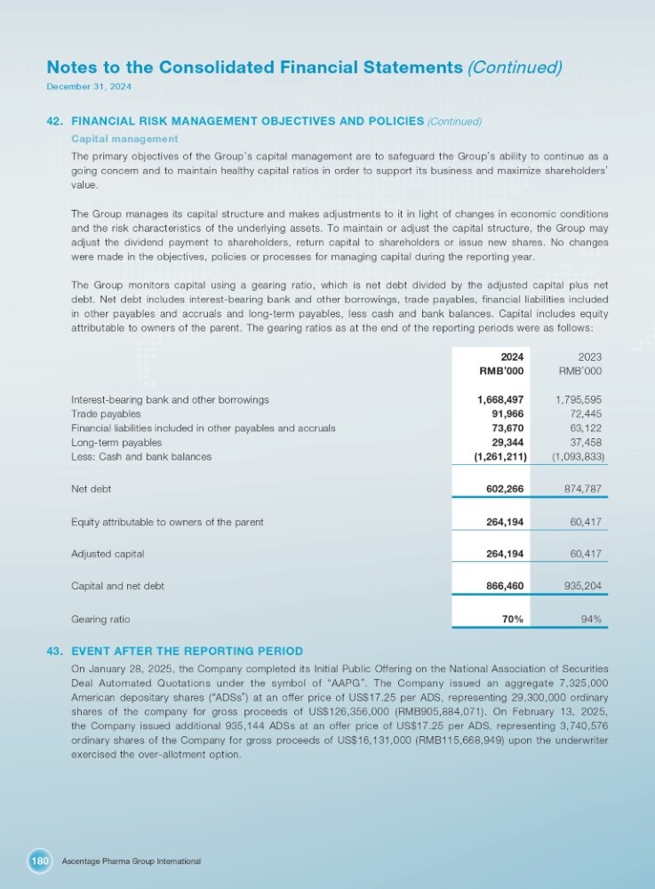 Ascentage Pharma Group International 180 Notes to the Consolidated Financial Statements (Continued) December 31, 2024 42. FINANCIAL RISK MANAGEMENT OBJECTIVES AND POLICIES (Continued) Capital management The primary objectives of the Group ’ s capital management are to safeguard the Group ’ s ability to continue as a going concern and to maintain healthy capital ratios in order to support its business and maximize shareholders ’ value . The Group manages its capital structure and makes adjustments to it in light of changes in economic conditions and the risk characteristics of the underlying assets . To maintain or adjust the capital structure, the Group may adjust the dividend payment to shareholders, return capital to shareholders or issue new shares . No changes were made in the objectives, policies or processes for managing capital during the reporting year . The Group monitors capital using a gearing ratio, which is net debt divided by the adjusted capital plus net debt . Net debt includes interest - bearing bank and other borrowings, trade payables, financial liabilities included in other payables and accruals and long - term payables, less cash and bank balances . Capital includes equity attributable to owners of the parent . The gearing ratios as at the end of the reporting periods were as follows : 2023 2024 RMB ’ 000 RMB ’ 000 1,795,595 1,668,497 72,445 91,966 63,122 73,670 37,458 29,344 (1,093,833) (1,261,211) 874,787 602,266 60,417 264,194 60,417 264,194 935,204 866,460 94% 70% Interest - bearing bank and other borrowings Trade payables Financial liabilities included in other payables and accruals Long - term payables Less: Cash and bank balances Net debt Equity attributable to owners of the parent Adjusted capital Capital and net debt Gearing ratio 43. EVENT AFTER THE REPORTING PERIOD On January 28 , 2025 , the Company completed its Initial Public Offering on the National Association of Securities Deal Automated Quotations under the symbol of “ AAPG ” . The Company issued an aggregate 7 , 325 , 000 American depositary shares ( “ ADSs ” ) at an offer price of US $ 17 . 25 per ADS, representing 29 , 300 , 000 ordinary shares of the company for gross proceeds of US $ 126 , 356 , 000 (RMB 905 , 884 , 071 ) . On February 13 , 2025 , the Company issued additional 935 , 144 ADSs at an offer price of US $ 17 . 25 per ADS, representing 3 , 740 , 576 ordinary shares of the Company for gross proceeds of US $ 16 , 131 , 000 (RMB 115 , 668 , 949 ) upon the underwriter exercised the over - allotment option .