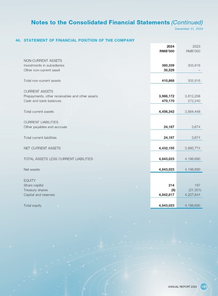 ANNUAL REPORT 2024 181 Notes to the Consolidated Financial Statements (Continued) December 31, 2024 44. STATEMENT OF FINANCIAL POSITION OF THE COMPANY NON - CURRENT ASSETS Investments in subsidiaries Other non - current asset Total non - current assets CURRENT ASSETS Prepayments, other receivables and other assets Cash and bank balances Total current assets CURRENT LIABILITIES Other payables and accruals Total current liabilities NET CURRENT ASSETS TOTAL ASSETS LESS CURRENT LIABILITIES Net assets EQUITY Share capital Treasury shares Capital and reserves Total equity 2023 2024 RMB ’ 000 RMB ’ 000 305,916 380,339 – 30,529 305,916 410,868 3,612,208 3,986,172 272,240 470,170 3,884,448 4,456,342 3,674 24,187 3,674 24,187 3,880,774 4,432,155 4,186,690 4,843,023 4,186,690 4,843,023 197 214 (21,351) (8) 4,207,844 4,842,817 4,186,690 4,843,023
