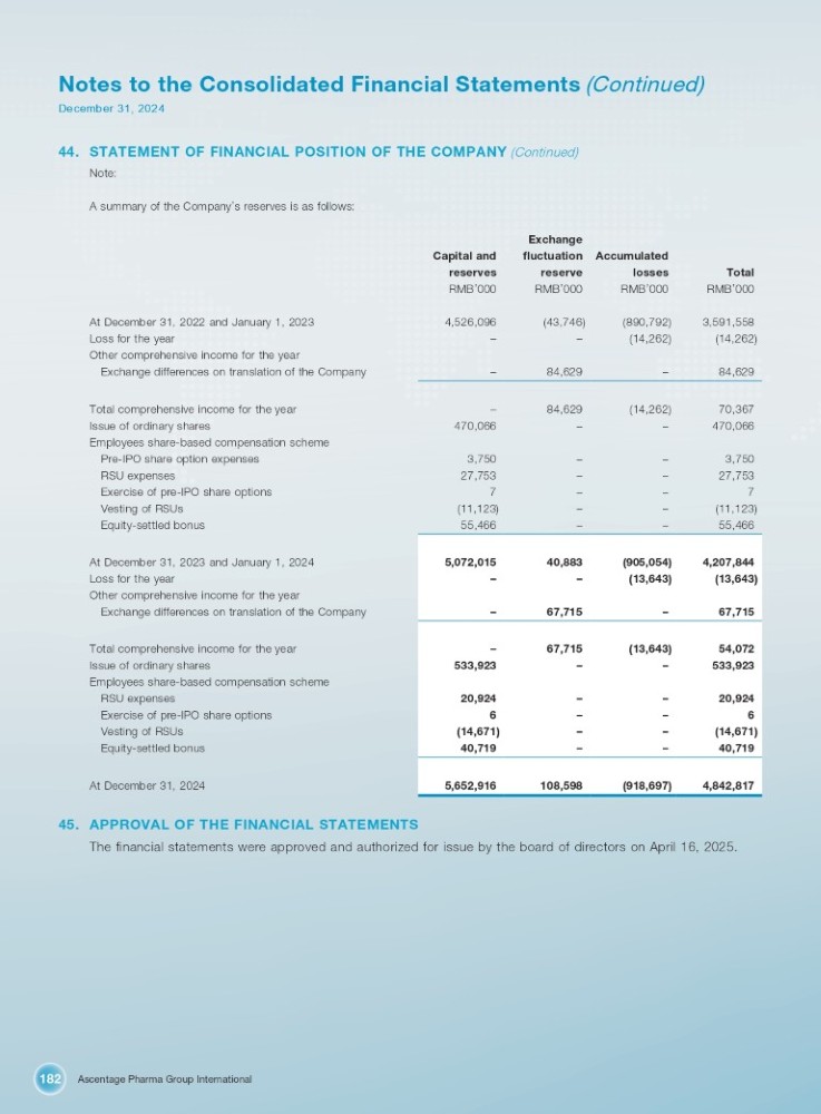 Ascentage Pharma Group International 182 Notes to the Consolidated Financial Statements (Continued) December 31, 2024 44. STATEMENT OF FINANCIAL POSITION OF THE COMPANY (Continued) Note: A summary of the Company ’ s reserves is as follows: Exchange Accumulated fluctuation Capital and Total RMB ’ 000 losses RMB ’ 000 reserve RMB ’ 000 reserves RMB ’ 000 3,591,558 (890,792) (43,746) 4,526,096 At December 31, 2022 and January 1, 2023 (14,262) (14,262) – – Loss for the year Other comprehensive income for the year 84,629 – 84,629 – Exchange differences on translation of the Company 70,367 (14,262) 84,629 – Total comprehensive income for the year 470,066 – – 470,066 Issue of ordinary shares Employees share - based compensation scheme 3,750 – – 3,750 Pre - IPO share option expenses 27,753 – – 27,753 RSU expenses 7 – – 7 Exercise of pre - IPO share options (11,123) – – (11,123) Vesting of RSUs 55,466 – – 55,466 Equity - settled bonus 4,207,844 (905,054) 40,883 5,072,015 (13,643) (13,643) – – 67,715 – 67,715 – 54,072 (13,643) 67,715 – 533,923 – – 533,923 20,924 – – 20,924 6 – – 6 (14,671) – – (14,671) 40,719 – – 40,719 4,842,817 (918,697) 108,598 5,652,916 At December 31, 2023 and January 1, 2024 Loss for the year Other comprehensive income for the year Exchange differences on translation of the Company Total comprehensive income for the year Issue of ordinary shares Employees share - based compensation scheme RSU expenses Exercise of pre - IPO share options Vesting of RSUs Equity - settled bonus At December 31, 2024 45. APPROVAL OF THE FINANCIAL STATEMENTS The financial statements were approved and authorized for issue by the board of directors on April 16, 2025.