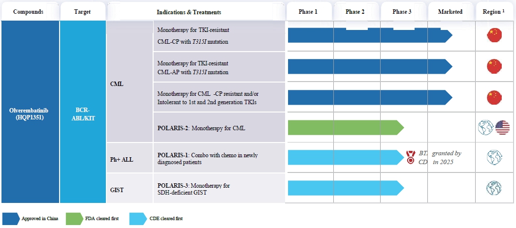 Our first product, Olverembatinib, is a novel, next-generation tyrosine kinase inhibitor, or TKI, that was the first BCR-ABL1 TKI approved in China for treatment of patients with CML in chronic phase, or CML-CP, with T315I mutations, CML in accelerated phase, or CML-AP, with T315I mutations, and CML-CP that is resistant and/or intolerant to first and second-generation TKIs. We are currently commercializing Olverembatinib in China. Since January 2025, all commercialized indications of Olverembatinib have been included in the NRDL, which bolstered the affordability and accessibility of the drug in China. We are currently conducting an FDA-cleared, registrational Phase III trial, called POLARIS-2, of Olverembatinib for CML. In addition, we are conducting registrational Phase III trials for patients with newly diagnosed Ph+ ALL and SDH-deficient GIST patients. In June 2024, we entered into an Exclusive Option Agreement with Takeda Pharmaceuticals International AG, or Takeda, pursuant to which we granted Takeda an exclusive option to enter into an exclusive license agreement for Olverembatinib. If exercised, the Option would allow Takeda to license global rights to develop and commercialize Olverembatinib in all territories outside of the PRC, Hong Kong, Macau, Taiwan and Russia.