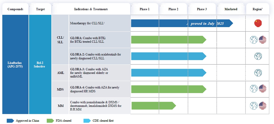 Our second product, Lisaftoclax, is a novel Bcl-2 inhibitor that, on July 10, 2025, was approved by China’s NMPA for the treatment of adult patients with CLL/SLL, who have previously received at least one systemic therapy including BTK inhibitors. This milestone makes Lisaftoclax the first Bcl-2 inhibitor receiving conditional approval and marketing authorization for the treatment of patients with CLL/SLL in China, and the second Bcl-2 inhibitor approved globally. We are also currently conducting four registrational Phase III trials of Lisaftoclax: (1) the GLORA study of Lisaftoclax in combination with BTK inhibitors in patients with CLL/SLL previously treated with BTK inhibitors for more than 12 months with suboptimal response, (2) the GLORA-2 study in combination with acalabrutinib in patients with newly diagnosed CLL/SLL, (3) the GLORA-3 study in combination with azacitidine, or AZA, in newly diagnosed, elderly and unfit patients with AML; and (4) the GLORA-4 study in combination with AZA in patients with newly diagnosed higher risk, or HR, MDS.
