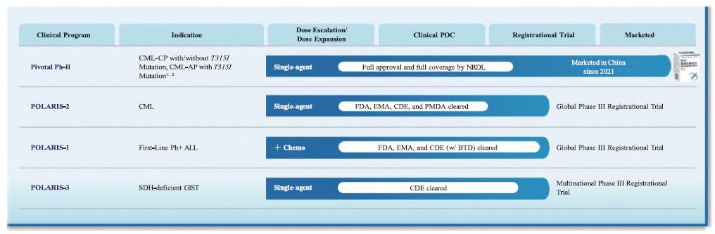 Our first product, Olverembatinib, is a novel, third-generation tyrosine kinase inhibitor, or TKI, that was the first BCR-ABL1 TKI approved in China for treatment of patients with CML in chronic phase, or CML-CP, with T315I mutations, CML in accelerated phase, or CML-AP, with T315I mutations, and CML-CP that is resistant and/or intolerant to first and second-generation TKIs. We are currently commercializing Olverembatinib in China. Since January 2025, all approved indications of Olverembatinib by the CDE have been included in the NRDL, which bolstered the affordability and accessibility of the drug in China. We are currently conducting an FDA and EMA-cleared, global Phase III registrational trial, called POLARIS-2, of Olverembatinib in CML patients, who have been previously treated with at least two prior TKIs, and currently conducting an FDA and EMA-cleared, global Phase III registrational trial, called POLARIS-1 of Olverembatinib in first-line Ph+ ALL patients. In addition, we are conducting multinational Phase III registrational trial for succinate dehydrogenase- (SDH-) deficient gastrointestinal stromal tumor (GIST) patients.