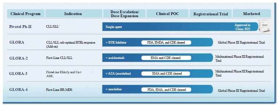 Our second product, Lisaftoclax, is a novel Bcl-2 inhibitor that we announced approval for on July 10, 2025, by the NMPA for the treatment of adult patients with CLL/SLL, who have previously received at least one systemic therapy including BTK inhibitors. This milestone makes Lisaftoclax the first Bcl-2 inhibitor receiving conditional approval and marketing authorization for the treatment of patients with CLL/SLL in China, and the second Bcl-2 inhibitor ever to be commercially approved. We are also currently conducting four registrational Phase III clinical trials of Lisaftoclax: (1) the global GLORA study of Lisaftoclax in combination with BTK inhibitors in patients with CLL/SLL previously treated with BTK inhibitors for more than 12 months with suboptimal response, (2) the multinational GLORA-2 study in combination with acalabrutinib in first-line CLL/SLL patients, (3) the multinational GLORA-3 study in combination with azacitidine, or AZA, in first-line elderly and unfit AML patients; and (4) the global GLORA-4 study in combination with AZA in first-line HR MDS patients.
