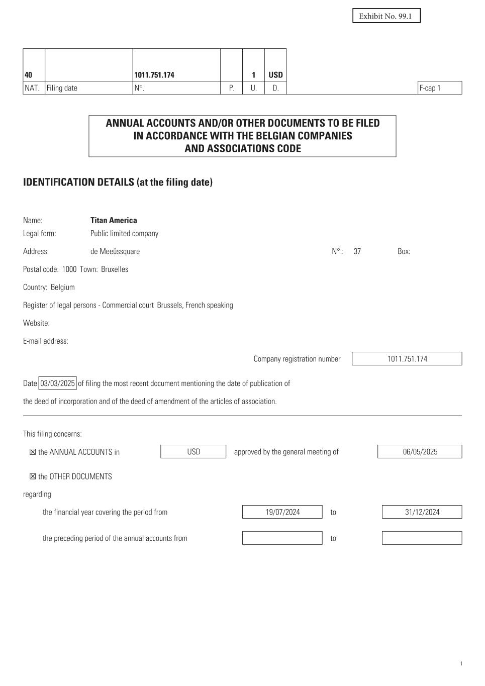 40 1011.751.174 1 USD NAT. Filing date N°. P. U. D. F-cap 1 ANNUAL ACCOUNTS AND/OR OTHER DOCUMENTS TO BE FILED IN ACCORDANCE WITH THE BELGIAN COMPANIES AND ASSOCIATIONS CODE IDENTIFICATION DETAILS (at the filing date) Name: Titan America Legal form: Public limited company Address: de Meeûssquare N°.: 37 Box: Postal code: 1000 Town: Bruxelles Country: Belgium Register of legal persons - Commercial court Brussels, French speaking Website: E-mail address: Company registration number       1011.751.174 Date 03/03/2025 of filing the most recent document mentioning the date of publication of the deed of incorporation and of the deed of amendment of the articles of association. This filing concerns: ☒ the ANNUAL ACCOUNTS in USD approved by the general meeting of 06/05/2025 ☒ the OTHER DOCUMENTS regarding the financial year covering the period from 19/07/2024 to 31/12/2024 the preceding period of the annual accounts from to 1 Exhibit No. 99.1