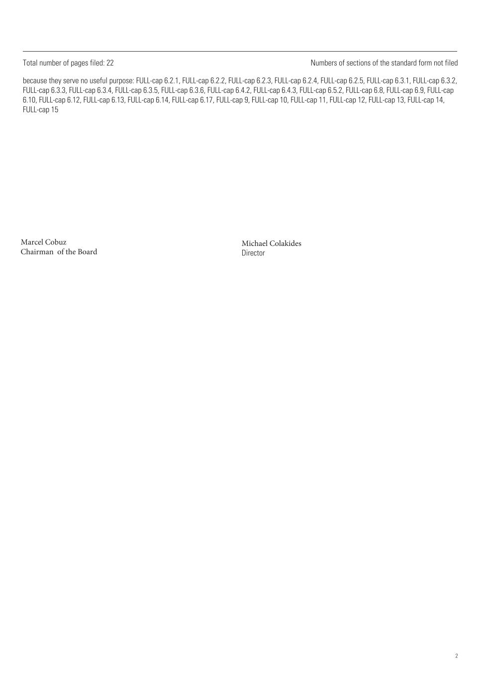 Total number of pages filed: 22 Numbers of sections of the standard form not filed because they serve no useful purpose: FULL-cap 6.2.1, FULL-cap 6.2.2, FULL-cap 6.2.3, FULL-cap 6.2.4, FULL-cap 6.2.5, FULL-cap 6.3.1, FULL-cap 6.3.2, FULL-cap 6.3.3, FULL-cap 6.3.4, FULL-cap 6.3.5, FULL-cap 6.3.6, FULL-cap 6.4.2, FULL-cap 6.4.3, FULL-cap 6.5.2, FULL-cap 6.8, FULL-cap 6.9, FULL-cap 6.10, FULL-cap 6.12, FULL-cap 6.13, FULL-cap 6.14, FULL-cap 6.17, FULL-cap 9, FULL-cap 10, FULL-cap 11, FULL-cap 12, FULL-cap 13, FULL-cap 14, FULL-cap 15 beba4e92fe11e5 Marcel Cobuz Chairman of the Board 7d0f9cfe5dfb13 Michael Colakides Director 2