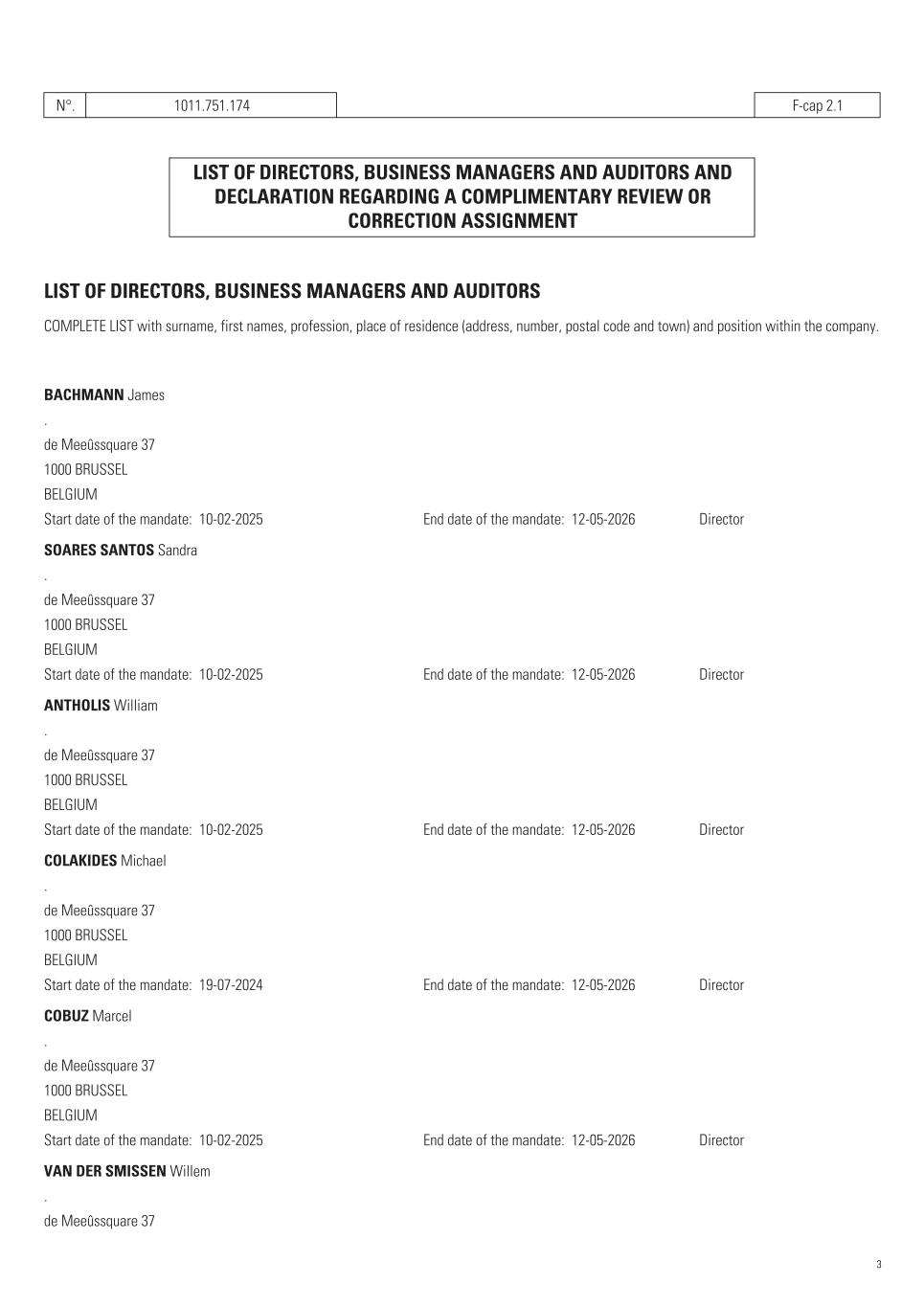 N°. 1011.751.174   F-cap 2.1   LIST OF DIRECTORS, BUSINESS MANAGERS AND AUDITORS AND DECLARATION REGARDING A COMPLIMENTARY REVIEW OR CORRECTION ASSIGNMENT   LIST OF DIRECTORS, BUSINESS MANAGERS AND AUDITORS COMPLETE LIST with surname, first names, profession, place of residence (address, number, postal code and town) and position within the company. BACHMANN James . de Meeûssquare 37 1000 BRUSSEL BELGIUM Start date of the mandate:  10-02-2025 End date of the mandate:  12-05-2026 Director SOARES SANTOS Sandra . de Meeûssquare 37 1000 BRUSSEL BELGIUM Start date of the mandate:  10-02-2025 End date of the mandate:  12-05-2026 Director ANTHOLIS William . de Meeûssquare 37 1000 BRUSSEL BELGIUM Start date of the mandate:  10-02-2025 End date of the mandate:  12-05-2026 Director COLAKIDES Michael . de Meeûssquare 37 1000 BRUSSEL BELGIUM Start date of the mandate:  19-07-2024 End date of the mandate:  12-05-2026 Director COBUZ Marcel . de Meeûssquare 37 1000 BRUSSEL BELGIUM Start date of the mandate:  10-02-2025 End date of the mandate:  12-05-2026 Director VAN DER SMISSEN Willem . de Meeûssquare 37 3