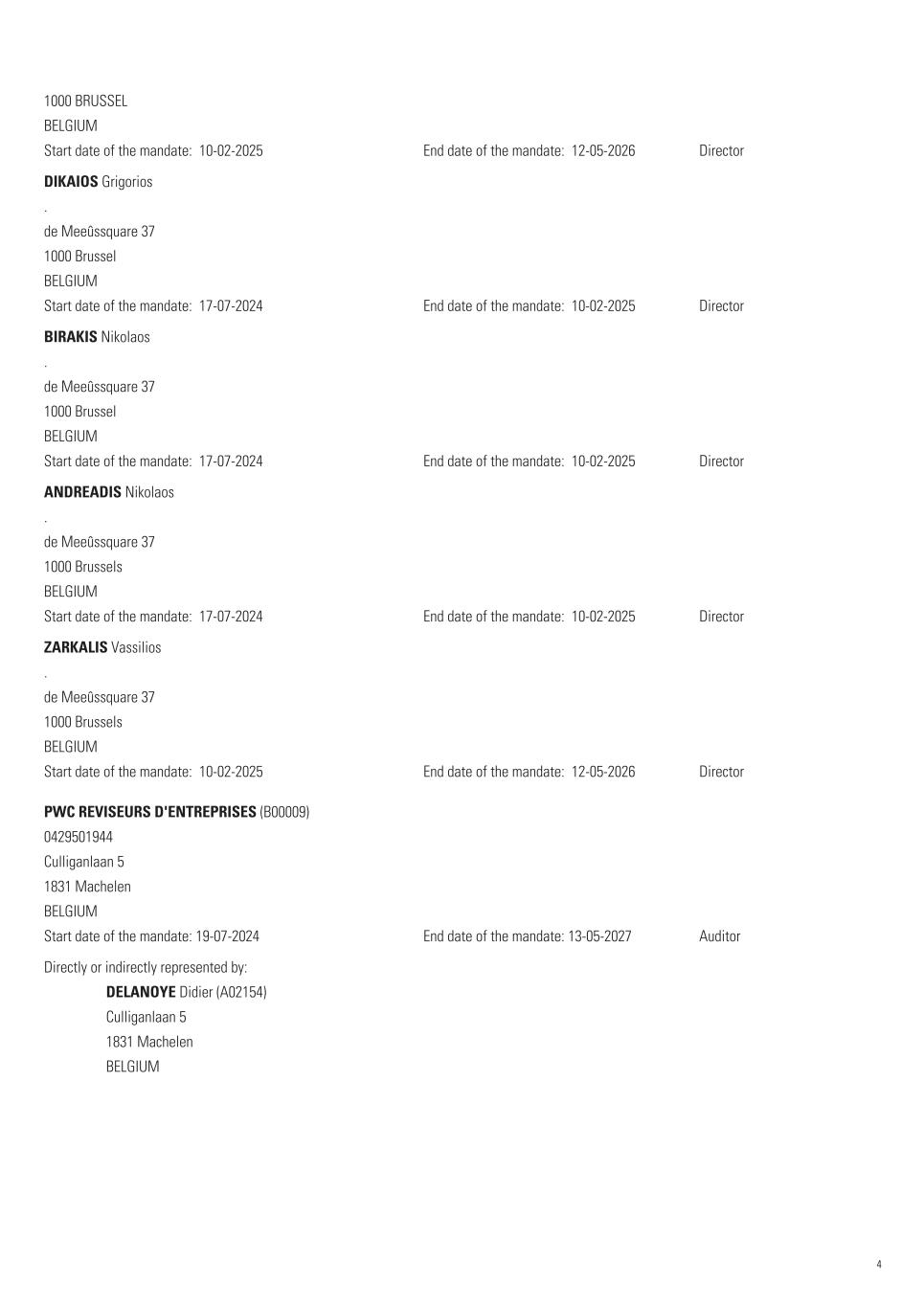1000 BRUSSEL BELGIUM Start date of the mandate:  10-02-2025 End date of the mandate:  12-05-2026 Director DIKAIOS Grigorios  . de Meeûssquare 37 1000 Brussel BELGIUM Start date of the mandate:  17-07-2024 End date of the mandate:  10-02-2025 Director BIRAKIS Nikolaos  . de Meeûssquare 37 1000 Brussel BELGIUM Start date of the mandate:  17-07-2024 End date of the mandate:  10-02-2025 Director ANDREADIS Nikolaos  . de Meeûssquare 37 1000 Brussels BELGIUM Start date of the mandate:  17-07-2024 End date of the mandate:  10-02-2025 Director ZARKALIS Vassilios  . de Meeûssquare 37 1000 Brussels BELGIUM Start date of the mandate:  10-02-2025 End date of the mandate:  12-05-2026 Director PWC REVISEURS D'ENTREPRISES (B00009) 0429501944 Culliganlaan 5 1831 Machelen BELGIUM Start date of the mandate: 19-07-2024 End date of the mandate: 13-05-2027 Auditor Directly or indirectly represented by: DELANOYE Didier (A02154) Culliganlaan 5 1831 Machelen BELGIUM 4