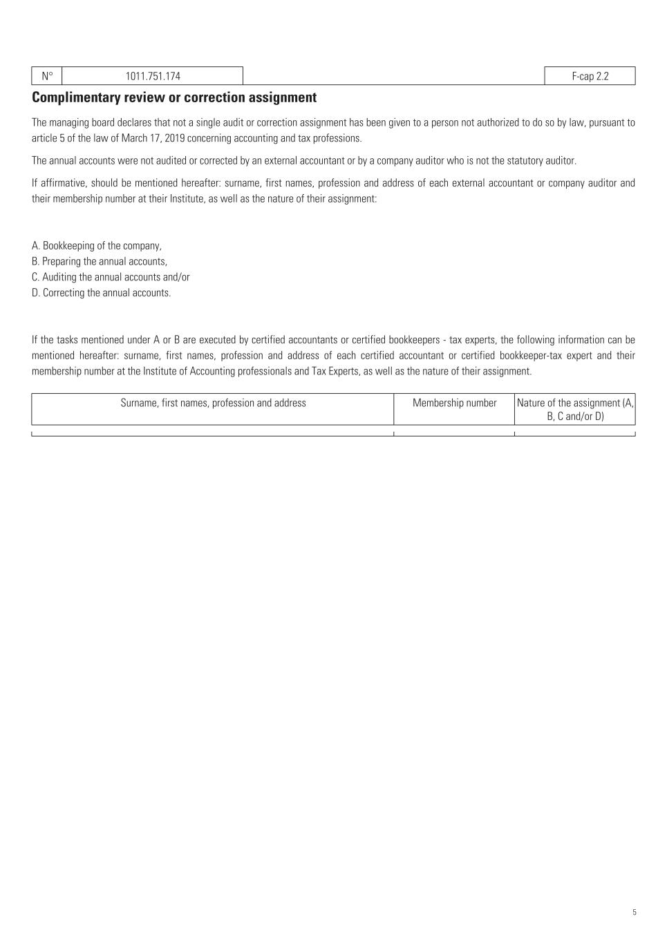 N° 1011.751.174   F-cap 2.2 Complimentary review or correction assignment The managing board declares that not a single audit or correction assignment has been given to a person not authorized to do so by law, pursuant to article 5 of the law of March 17, 2019 concerning accounting and tax professions. The annual accounts were not audited or corrected by an external accountant or by a company auditor who is not the statutory auditor. If affirmative, should be mentioned hereafter: surname, first names, profession and address of each external accountant or company auditor and their membership number at their Institute, as well as the nature of their assignment: A. Bookkeeping of the company, B. Preparing the annual accounts, C. Auditing the annual accounts and/or D. Correcting the annual accounts. If the tasks mentioned under A or B are executed by certified accountants or certified bookkeepers - tax experts, the following information can be mentioned hereafter: surname, first names, profession and address of each certified accountant or certified bookkeeper-tax expert and their membership number at the Institute of Accounting professionals and Tax Experts, as well as the nature of their assignment. Surname, first names, profession and address Membership number Nature of the assignment (A, B, C and/or D) 5