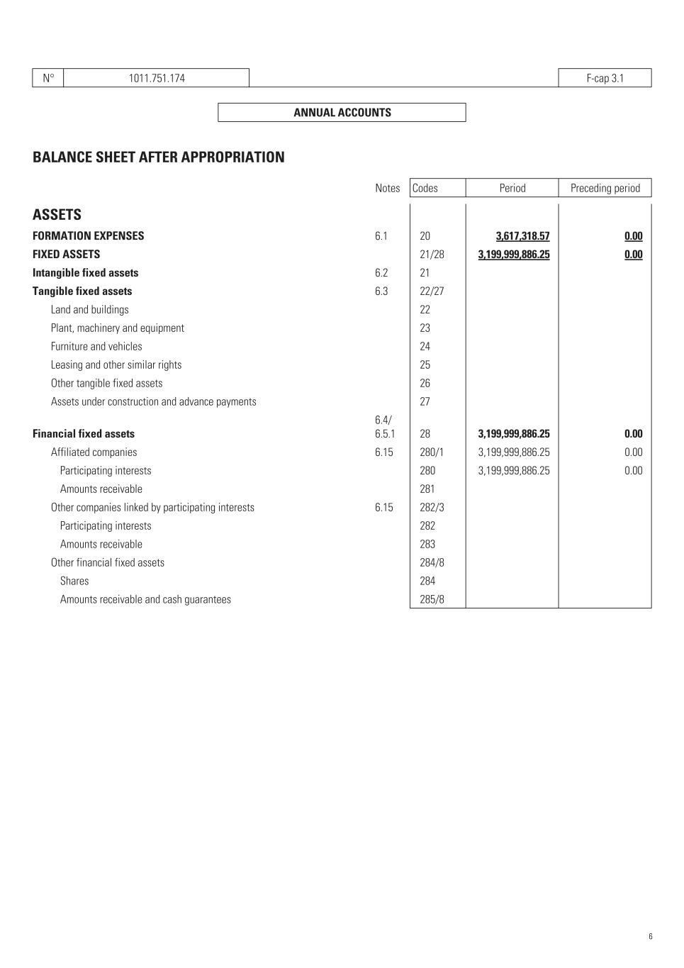 N° 1011.751.174   F-cap 3.1   ANNUAL ACCOUNTS   BALANCE SHEET AFTER APPROPRIATION Notes Codes Period Preceding period ASSETS FORMATION EXPENSES 6.1    20 3,617,318.57    0.00    FIXED ASSETS    21/28 3,199,999,886.25    0.00    Intangible fixed assets 6.2    21       Tangible fixed assets 6.3    22/27       Land and buildings    22       Plant, machinery and equipment    23       Furniture and vehicles    24       Leasing and other similar rights    25       Other tangible fixed assets    26       Assets under construction and advance payments    27       Financial fixed assets 6.4/ 6.5.1    28 3,199,999,886.25    0.00    Affiliated companies 6.15    280/1 3,199,999,886.25    0.00    Participating interests    280 3,199,999,886.25    0.00    Amounts receivable    281       Other companies linked by participating interests 6.15    282/3       Participating interests    282       Amounts receivable    283       Other financial fixed assets    284/8       Shares    284       Amounts receivable and cash guarantees    285/8       6