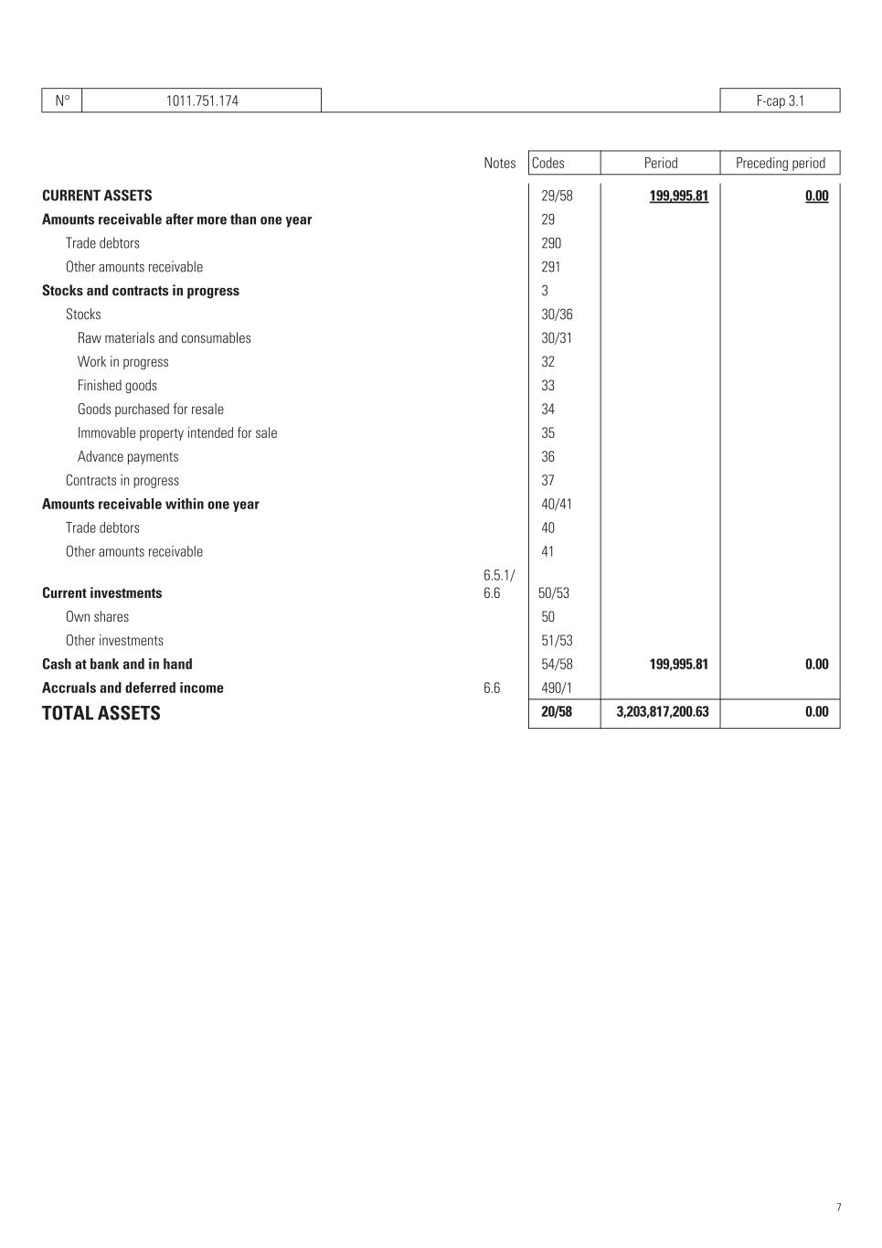 N° 1011.751.174   F-cap 3.1 Notes Codes Period Preceding period CURRENT ASSETS    29/58 199,995.81    0.00    Amounts receivable after more than one year    29       Trade debtors    290       Other amounts receivable    291       Stocks and contracts in progress    3       Stocks    30/36       Raw materials and consumables    30/31       Work in progress    32       Finished goods    33       Goods purchased for resale    34       Immovable property intended for sale    35       Advance payments    36       Contracts in progress    37       Amounts receivable within one year    40/41       Trade debtors    40       Other amounts receivable    41       Current investments 6.5.1/ 6.6   50/53       Own shares    50       Other investments    51/53       Cash at bank and in hand    54/58 199,995.81    0.00    Accruals and deferred income 6.6    490/1       TOTAL ASSETS    20/58 3,203,817,200.63    0.00    7