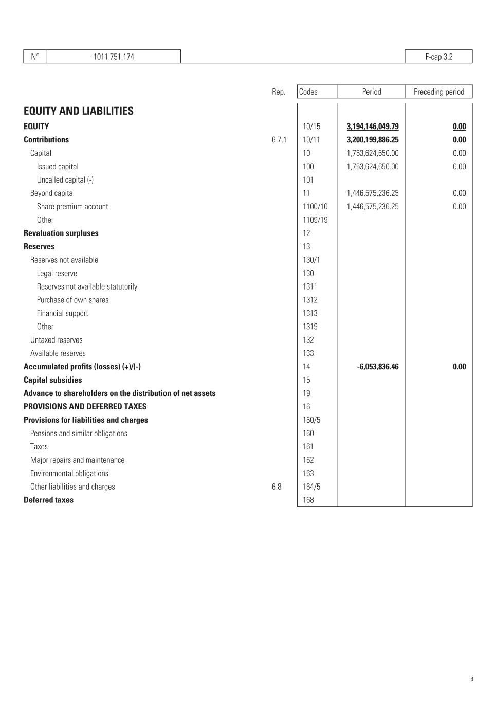 N° 1011.751.174   F-cap 3.2 Rep. Codes Period Preceding period EQUITY AND LIABILITIES EQUITY   10/15 3,194,146,049.79    0.00    Contributions 6.7.1   10/11 3,200,199,886.25    0.00    Capital   10 1,753,624,650.00    0.00    Issued capital   100 1,753,624,650.00    0.00    Uncalled capital (-)   101       Beyond capital   11 1,446,575,236.25    0.00    Share premium account   1100/10 1,446,575,236.25    0.00    Other   1109/19       Revaluation surpluses   12       Reserves   13       Reserves not available   130/1       Legal reserve   130       Reserves not available statutorily   1311       Purchase of own shares   1312       Financial support   1313       Other   1319       Untaxed reserves   132       Available reserves   133       Accumulated profits (losses) (+)/(-)   14 -6,053,836.46    0.00    Capital subsidies   15       Advance to shareholders on the distribution of net assets   19       PROVISIONS AND DEFERRED TAXES   16       Provisions for liabilities and charges   160/5       Pensions and similar obligations   160       Taxes   161       Major repairs and maintenance   162       Environmental obligations   163       Other liabilities and charges 6.8   164/5       Deferred taxes   168       8