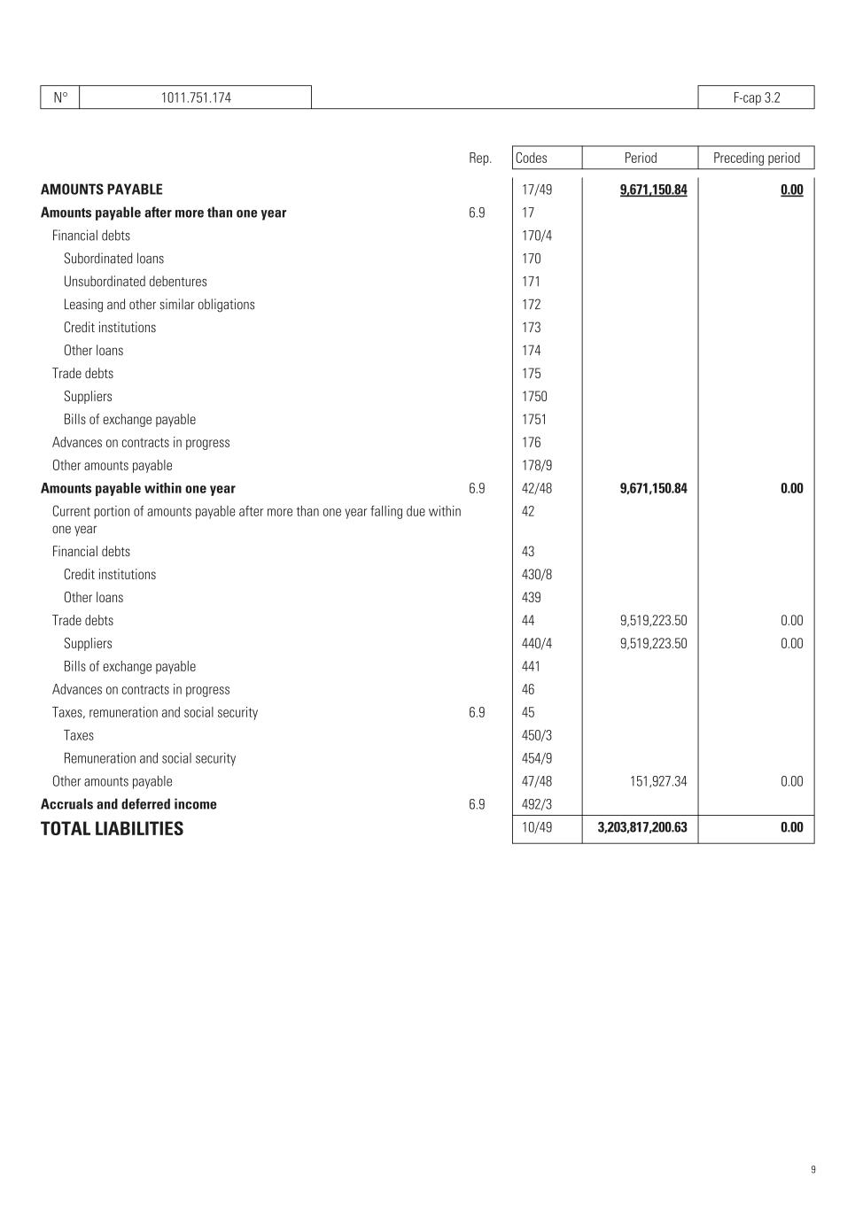 N° 1011.751.174   F-cap 3.2 Rep. Codes Period Preceding period AMOUNTS PAYABLE   17/49 9,671,150.84    0.00    Amounts payable after more than one year 6.9   17       Financial debts   170/4       Subordinated loans   170       Unsubordinated debentures   171       Leasing and other similar obligations   172       Credit institutions   173       Other loans   174       Trade debts   175       Suppliers   1750       Bills of exchange payable   1751       Advances on contracts in progress   176       Other amounts payable   178/9       Amounts payable within one year 6.9   42/48 9,671,150.84    0.00    Current portion of amounts payable after more than one year falling due within one year   42       Financial debts   43       Credit institutions   430/8       Other loans   439       Trade debts   44 9,519,223.50    0.00    Suppliers   440/4 9,519,223.50    0.00    Bills of exchange payable   441       Advances on contracts in progress   46       Taxes, remuneration and social security 6.9   45       Taxes   450/3       Remuneration and social security   454/9       Other amounts payable   47/48 151,927.34    0.00    Accruals and deferred income 6.9   492/3       TOTAL LIABILITIES   10/49 3,203,817,200.63    0.00    9