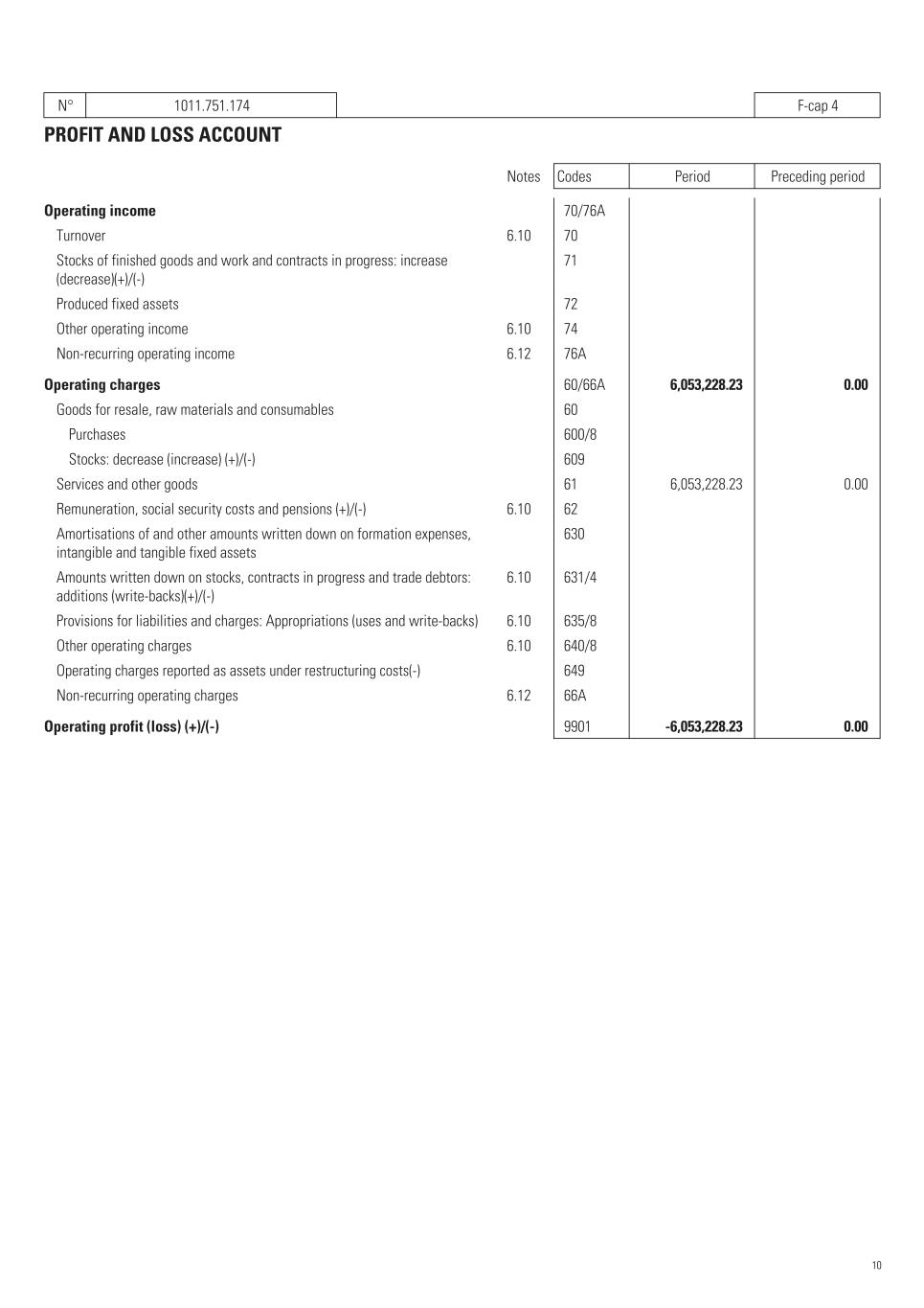 N° 1011.751.174   F-cap 4 PROFIT AND LOSS ACCOUNT Notes Codes Period Preceding period Operating income   70/76A       Turnover 6.10   70       Stocks of finished goods and work and contracts in progress: increase (decrease)(+)/(-)   71       Produced fixed assets   72       Other operating income 6.10   74       Non-recurring operating income 6.12   76A       Operating charges   60/66A 6,053,228.23    0.00    Goods for resale, raw materials and consumables   60       Purchases   600/8       Stocks: decrease (increase) (+)/(-)   609       Services and other goods   61 6,053,228.23    0.00    Remuneration, social security costs and pensions (+)/(-) 6.10   62       Amortisations of and other amounts written down on formation expenses, intangible and tangible fixed assets   630       Amounts written down on stocks, contracts in progress and trade debtors: additions (write-backs)(+)/(-) 6.10   631/4       Provisions for liabilities and charges: Appropriations (uses and write-backs) 6.10   635/8       Other operating charges 6.10   640/8       Operating charges reported as assets under restructuring costs(-)   649       Non-recurring operating charges 6.12   66A       Operating profit (loss) (+)/(-)   9901 -6,053,228.23    0.00    10
