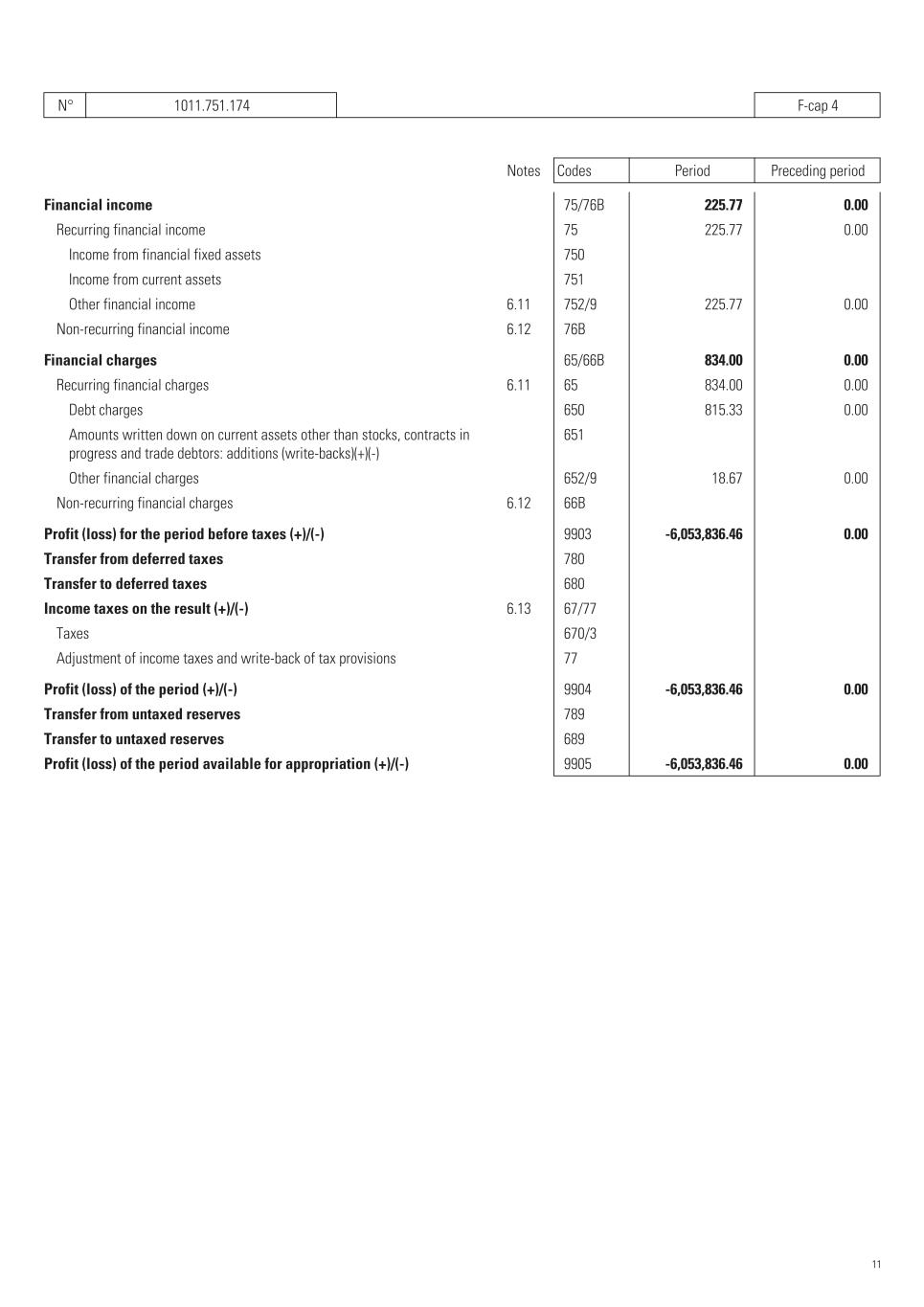 N° 1011.751.174   F-cap 4 Notes Codes Period Preceding period Financial income   75/76B 225.77    0.00    Recurring financial income   75 225.77    0.00    Income from financial fixed assets   750       Income from current assets   751       Other financial income 6.11   752/9 225.77    0.00    Non-recurring financial income 6.12   76B       Financial charges   65/66B 834.00    0.00    Recurring financial charges 6.11   65 834.00    0.00    Debt charges   650 815.33    0.00    Amounts written down on current assets other than stocks, contracts in progress and trade debtors: additions (write-backs)(+)(-)   651       Other financial charges   652/9 18.67    0.00    Non-recurring financial charges 6.12   66B       Profit (loss) for the period before taxes (+)/(-)   9903 -6,053,836.46    0.00    Transfer from deferred taxes   780       Transfer to deferred taxes   680       Income taxes on the result (+)/(-) 6.13   67/77       Taxes   670/3       Adjustment of income taxes and write-back of tax provisions   77       Profit (loss) of the period (+)/(-)   9904 -6,053,836.46    0.00    Transfer from untaxed reserves   789       Transfer to untaxed reserves   689       Profit (loss) of the period available for appropriation (+)/(-)   9905 -6,053,836.46    0.00    11