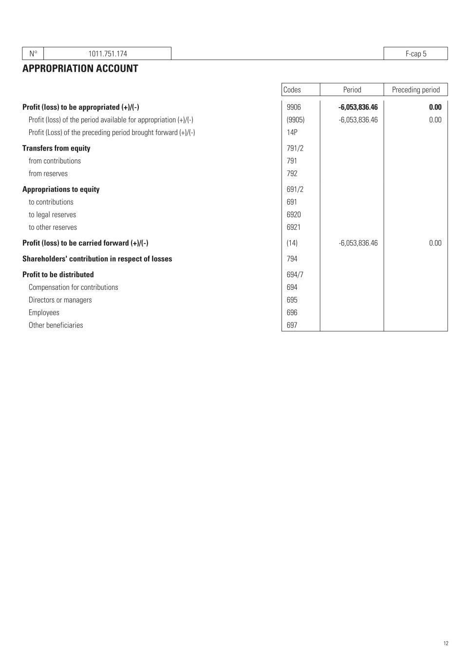 N° 1011.751.174   F-cap 5 APPROPRIATION ACCOUNT Codes Period Preceding period Profit (loss) to be appropriated (+)/(-)   9906 -6,053,836.46    0.00    Profit (loss) of the period available for appropriation (+)/(-)   (9905) -6,053,836.46    0.00    Profit (Loss) of the preceding period brought forward (+)/(-)   14P       Transfers from equity   791/2       from contributions   791       from reserves   792       Appropriations to equity   691/2       to contributions   691       to legal reserves   6920       to other reserves   6921       Profit (loss) to be carried forward (+)/(-)   (14) -6,053,836.46    0.00    Shareholders' contribution in respect of losses   794       Profit to be distributed   694/7       Compensation for contributions   694       Directors or managers   695       Employees   696       Other beneficiaries   697       12