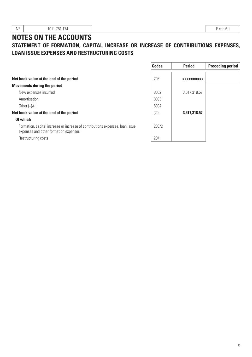 N° 1011.751.174   F-cap 6.1 NOTES ON THE ACCOUNTS STATEMENT OF FORMATION, CAPITAL INCREASE OR INCREASE OF CONTRIBUTIONS EXPENSES, LOAN ISSUE EXPENSES AND RESTRUCTURING COSTS Codes Period Preceding period Net book value at the end of the period   20P xxxxxxxxxx      Movements during the period New expenses incurred   8002 3,617,318.57    Amortisation   8003    Other (+)/(-)   8004    Net book value at the end of the period   (20) 3,617,318.57    Of which Formation, capital increase or increase of contributions expenses, loan issue expenses and other formation expenses   200/2    Restructuring costs   204    13