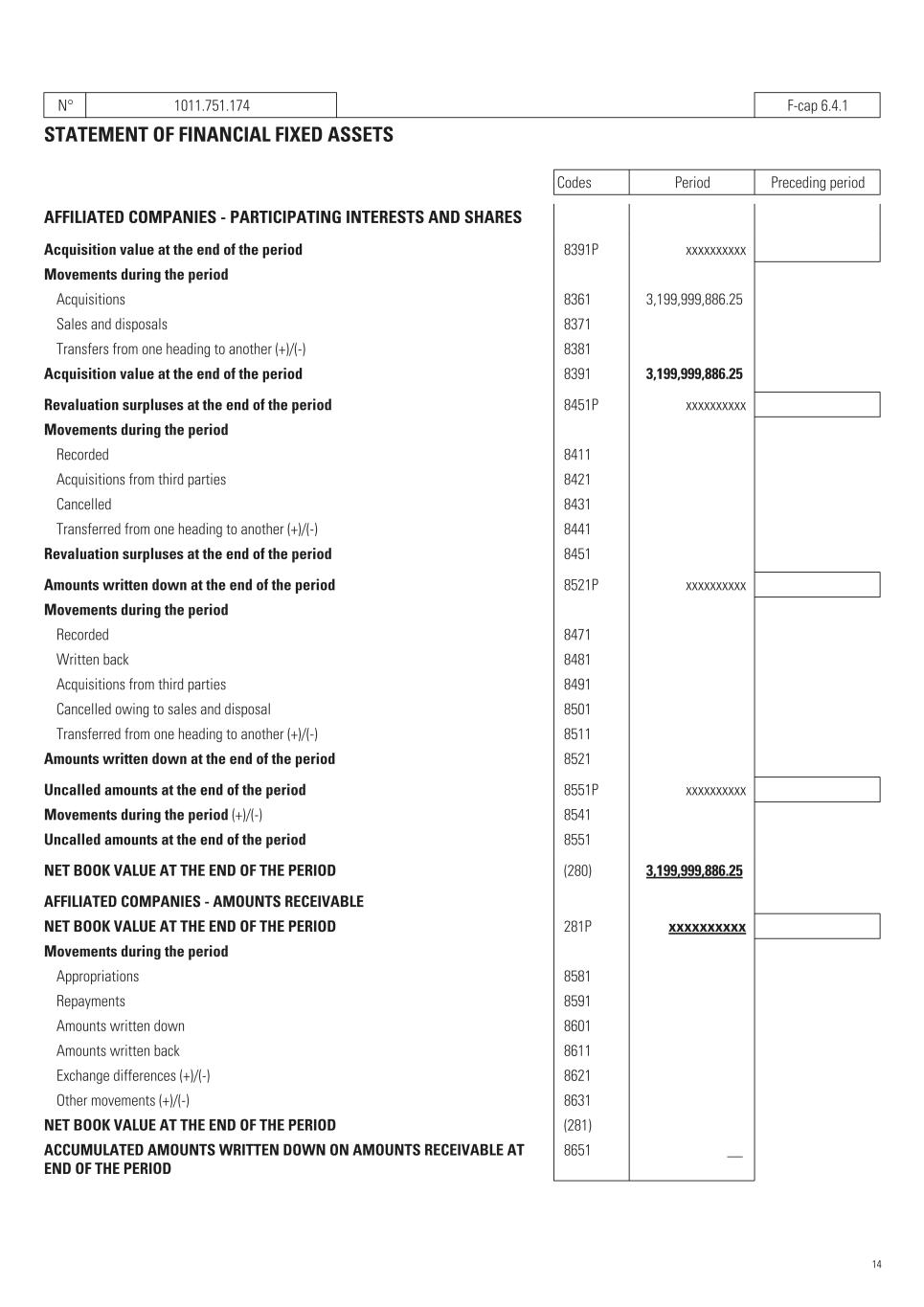 N° 1011.751.174   F-cap 6.4.1 STATEMENT OF FINANCIAL FIXED ASSETS Codes Period Preceding period AFFILIATED COMPANIES - PARTICIPATING INTERESTS AND SHARES Acquisition value at the end of the period   8391P xxxxxxxxxx      Movements during the period Acquisitions   8361 3,199,999,886.25    Sales and disposals   8371    Transfers from one heading to another (+)/(-)   8381    Acquisition value at the end of the period   8391 3,199,999,886.25    Revaluation surpluses at the end of the period   8451P xxxxxxxxxx      Movements during the period Recorded   8411    Acquisitions from third parties   8421    Cancelled   8431    Transferred from one heading to another (+)/(-)   8441    Revaluation surpluses at the end of the period   8451    Amounts written down at the end of the period   8521P xxxxxxxxxx      Movements during the period Recorded   8471    Written back   8481    Acquisitions from third parties   8491    Cancelled owing to sales and disposal   8501    Transferred from one heading to another (+)/(-)   8511    Amounts written down at the end of the period   8521    Uncalled amounts at the end of the period   8551P xxxxxxxxxx      Movements during the period (+)/(-)   8541    Uncalled amounts at the end of the period   8551    NET BOOK VALUE AT THE END OF THE PERIOD   (280) 3,199,999,886.25    AFFILIATED COMPANIES - AMOUNTS RECEIVABLE NET BOOK VALUE AT THE END OF THE PERIOD   281P xxxxxxxxxx      Movements during the period Appropriations   8581    Repayments   8591    Amounts written down   8601    Amounts written back   8611    Exchange differences (+)/(-)   8621    Other movements (+)/(-)   8631    NET BOOK VALUE AT THE END OF THE PERIOD   (281)    ACCUMULATED AMOUNTS WRITTEN DOWN ON AMOUNTS RECEIVABLE AT END OF THE PERIOD   8651 __    14