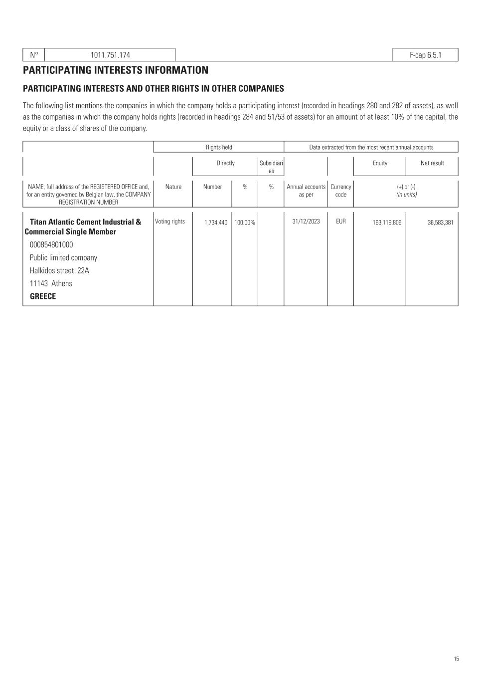 N° 1011.751.174   F-cap 6.5.1 PARTICIPATING INTERESTS INFORMATION PARTICIPATING INTERESTS AND OTHER RIGHTS IN OTHER COMPANIES The following list mentions the companies in which the company holds a participating interest (recorded in headings 280 and 282 of assets), as well as the companies in which the company holds rights (recorded in headings 284 and 51/53 of assets) for an amount of at least 10% of the capital, the equity or a class of shares of the company. Rights held Data extracted from the most recent annual accounts Directly Subsidiari es Equity Net result NAME, full address of the REGISTERED OFFICE and, for an entity governed by Belgian law, the COMPANY REGISTRATION NUMBER Nature Number % % Annual accounts as per Currency code (+) or (-) (in units)    Titan Atlantic Cement Industrial & Commercial Single Member Voting rights 1,734,440   100.00%       31/12/2023 EUR 163,119,806   36,583,381      000854801000    Public limited company    Halkidos street  22A    11143  Athens    GREECE 15