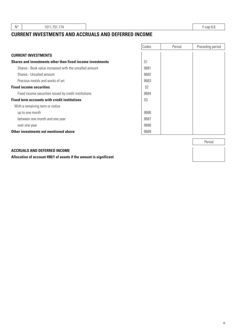N° 1011.751.174   F-cap 6.6 CURRENT INVESTMENTS AND ACCRUALS AND DEFERRED INCOME Codes Period Preceding period CURRENT INVESTMENTS Shares and investments other than fixed income investments   51       Shares - Book value increased with the uncalled amount   8681       Shares - Uncalled amount   8682       Precious metals and works of art   8683       Fixed income securities    52       Fixed income securities issued by credit institutions   8684       Fixed term accounts with credit institutions   53       With a remaining term or notice up to one month   8686       between one month and one year   8687       over one year   8688       Other investments not mentioned above   8689       Period ACCRUALS AND DEFERRED INCOME Allocation of account 490/1 of assets if the amount is significant 16