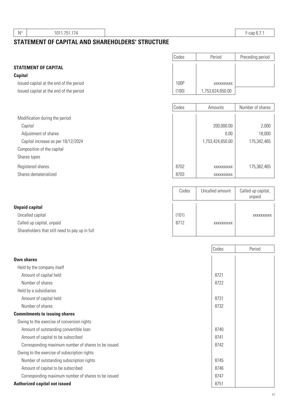 N° 1011.751.174   F-cap 6.7.1 STATEMENT OF CAPITAL AND SHAREHOLDERS' STRUCTURE Codes Period Preceding period STATEMENT OF CAPITAL Capital Issued capital at the end of the period   100P xxxxxxxxxx      Issued capital at the end of the period   (100) 1,753,624,650.00       Codes Amounts Number of shares Modification during the period Capital 200,000.00   2,000    Adjustment of shares 0.00   18,000    Capital increase as per 18/12/2024 1,753,424,650.00   175,342,465    Composition of the capital Shares types Registered shares   8702 xxxxxxxxxx   175,362,465    Shares dematerialized   8703 xxxxxxxxxx      Codes Uncalled amount Called up capital, unpaid Unpaid capital Uncalled capital   (101)    xxxxxxxxxx   Called up capital, unpaid   8712 xxxxxxxxxx   Shareholders that still need to pay up in full Codes Period Own shares Held by the company itself Amount of capital held   8721    Number of shares   8722    Held by a subsidiaries Amount of capital held   8731    Number of shares   8732    Commitments to issuing shares Owing to the exercise of conversion rights Amount of outstanding convertible loan   8740    Amount of capital to be subscribed   8741    Corresponding maximum number of shares to be issued   8742    Owing to the exercise of subscription rights Number of outstanding subscription rights   8745 Amount of capital to be subscribed   8746    Corresponding maximum number of shares to be issued   8747    Authorized capital not issued   8751 17
