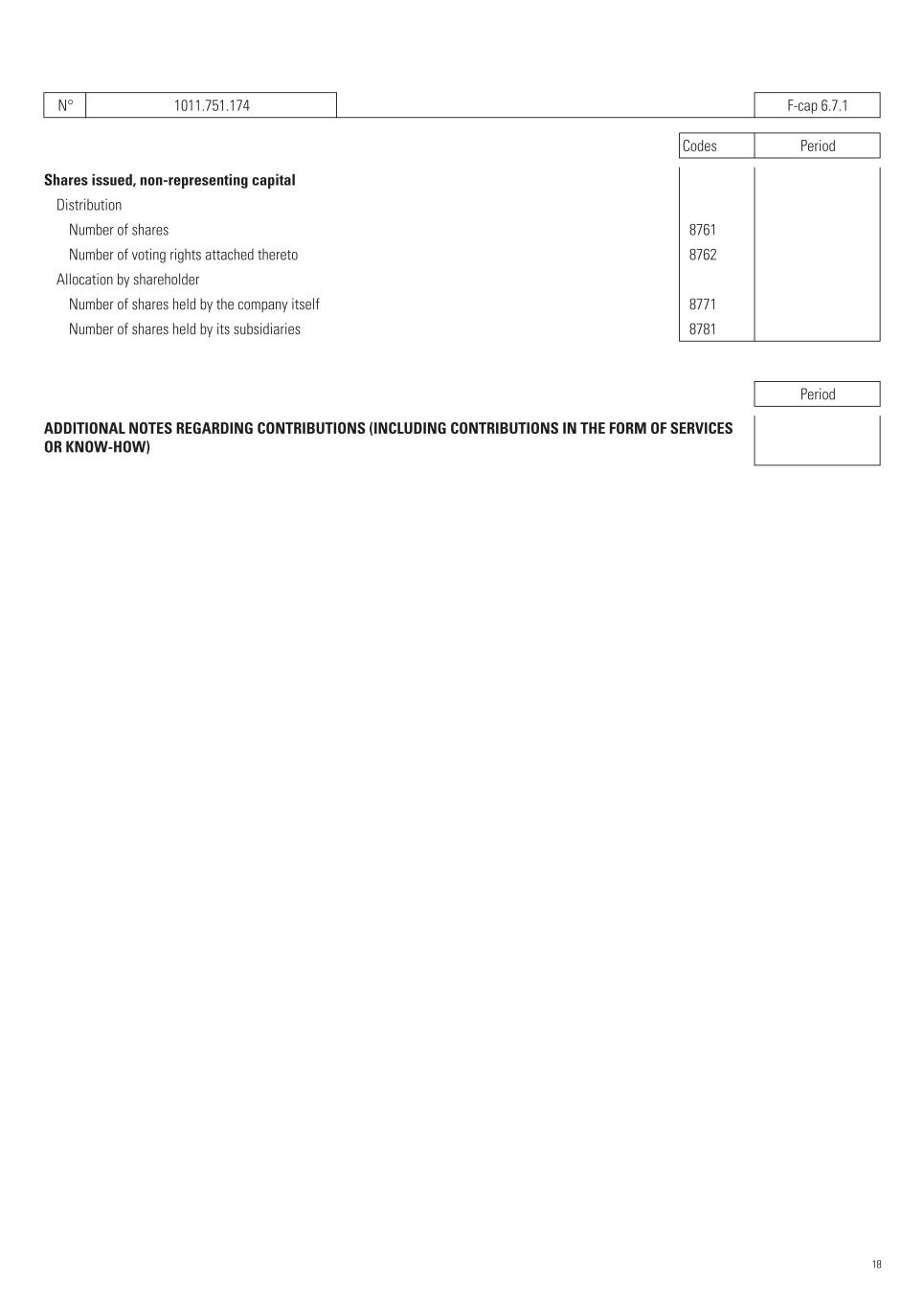 N° 1011.751.174   F-cap 6.7.1 Codes Period Shares issued, non-representing capital Distribution Number of shares   8761 Number of voting rights attached thereto   8762 Allocation by shareholder Number of shares held by the company itself   8771 Number of shares held by its subsidiaries   8781 Period ADDITIONAL NOTES REGARDING CONTRIBUTIONS (INCLUDING CONTRIBUTIONS IN THE FORM OF SERVICES OR KNOW-HOW) 18