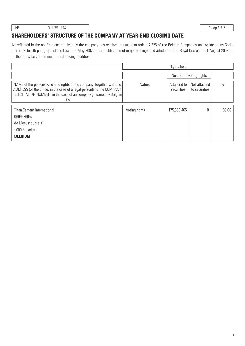 N° 1011.751.174   F-cap 6.7.2 SHAREHOLDERS' STRUCTURE OF THE COMPANY AT YEAR-END CLOSING DATE As reflected in the notifications received by the company has received pursuant to article 7:225 of the Belgian Companies and Associations Code, article 14 fourth paragraph of the Law of 2 May 2007 on the publication of major holdings and article 5 of the Royal Decree of 21 August 2008 on further rules for certain multilateral trading facilities. Rights held Number of voting rights NAME of the persons who hold rights of the company, together with the ADDRESS (of the office, in the case of a legal person)and the COMPANY REGISTRATION NUMBER, in the case of an company governed by Belgian law Nature Attached to securities Not attached to securities %   Titan Cement International    Voting rights 175,362,465   0   100.00     0699936657   de Meeûssquare 37   1000 Bruxelles   BELGIUM 19
