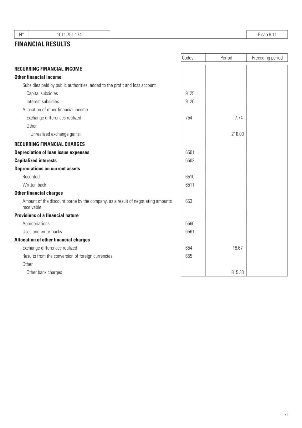N° 1011.751.174   F-cap 6.11 FINANCIAL RESULTS Codes Period Preceding period RECURRING FINANCIAL INCOME Other financial income Subsidies paid by public authorities, added to the profit and loss account Capital subsidies    9125       Interest subsidies    9126       Allocation of other financial income Exchange differences realized    754 7.74       Other Unrealized exchange gains: 218.03      RECURRING FINANCIAL CHARGES Depreciation of loan issue expenses    6501       Capitalized interests    6502       Depreciations on current assets Recorded    6510       Written back    6511       Other financial charges Amount of the discount borne by the company, as a result of negotiating amounts receivable    653       Provisions of a financial nature Appropriations    6560       Uses and write-backs    6561       Allocation of other financial charges Exchange differences realized    654 18.67       Results from the conversion of foreign currencies    655       Other Other bank charges 815.33      20