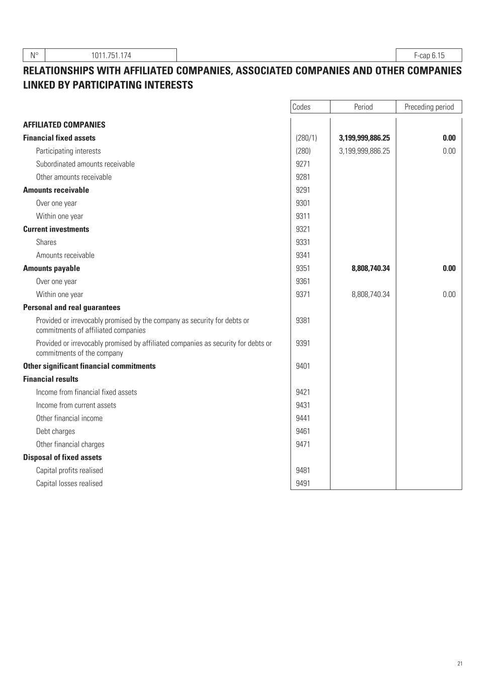N° 1011.751.174   F-cap 6.15 RELATIONSHIPS WITH AFFILIATED COMPANIES, ASSOCIATED COMPANIES AND OTHER COMPANIES LINKED BY PARTICIPATING INTERESTS Codes Period Preceding period AFFILIATED COMPANIES Financial fixed assets   (280/1) 3,199,999,886.25    0.00    Participating interests   (280) 3,199,999,886.25    0.00    Subordinated amounts receivable   9271       Other amounts receivable   9281       Amounts receivable   9291       Over one year   9301       Within one year   9311       Current investments   9321       Shares   9331       Amounts receivable   9341       Amounts payable   9351 8,808,740.34    0.00    Over one year   9361       Within one year   9371 8,808,740.34    0.00    Personal and real guarantees Provided or irrevocably promised by the company as security for debts or commitments of affiliated companies   9381       Provided or irrevocably promised by affiliated companies as security for debts or commitments of the company   9391       Other significant financial commitments   9401       Financial results Income from financial fixed assets   9421       Income from current assets   9431       Other financial income   9441       Debt charges   9461       Other financial charges   9471       Disposal of fixed assets Capital profits realised   9481       Capital losses realised   9491       21