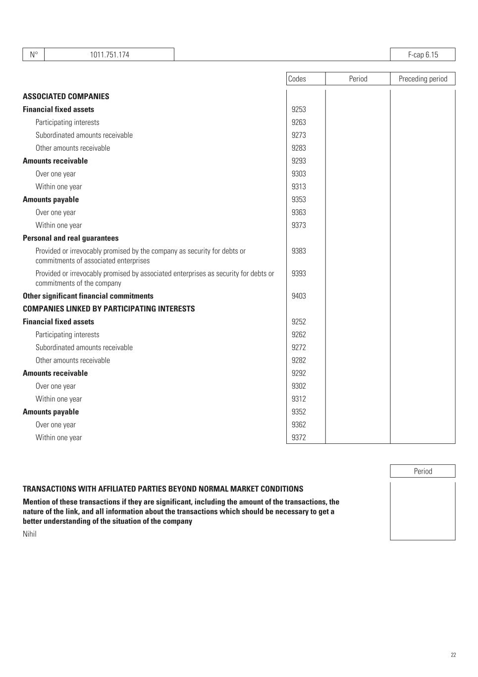 N° 1011.751.174   F-cap 6.15 Codes Period Preceding period ASSOCIATED COMPANIES Financial fixed assets   9253       Participating interests   9263       Subordinated amounts receivable   9273       Other amounts receivable   9283       Amounts receivable   9293       Over one year   9303       Within one year   9313       Amounts payable   9353       Over one year   9363       Within one year   9373       Personal and real guarantees Provided or irrevocably promised by the company as security for debts or commitments of associated enterprises   9383       Provided or irrevocably promised by associated enterprises as security for debts or commitments of the company   9393       Other significant financial commitments   9403       COMPANIES LINKED BY PARTICIPATING INTERESTS Financial fixed assets   9252       Participating interests   9262       Subordinated amounts receivable   9272       Other amounts receivable   9282       Amounts receivable   9292       Over one year   9302       Within one year   9312       Amounts payable   9352       Over one year   9362       Within one year   9372       Period TRANSACTIONS WITH AFFILIATED PARTIES BEYOND NORMAL MARKET CONDITIONS Mention of these transactions if they are significant, including the amount of the transactions, the nature of the link, and all information about the transactions which should be necessary to get a better understanding of the situation of the company Nihil 22