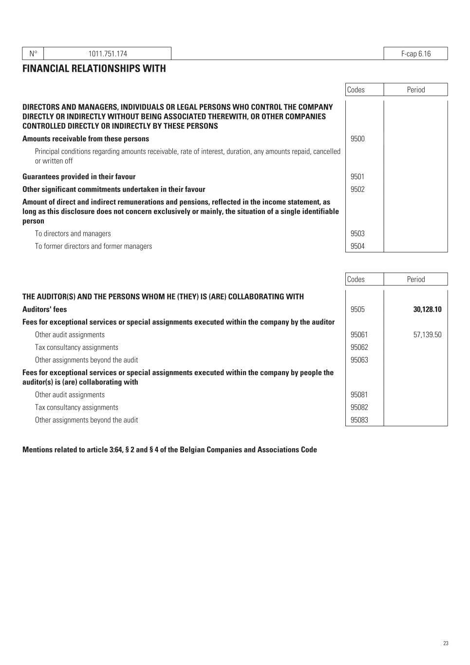 N° 1011.751.174   F-cap 6.16 FINANCIAL RELATIONSHIPS WITH Codes Period DIRECTORS AND MANAGERS, INDIVIDUALS OR LEGAL PERSONS WHO CONTROL THE COMPANY DIRECTLY OR INDIRECTLY WITHOUT BEING ASSOCIATED THEREWITH, OR OTHER COMPANIES CONTROLLED DIRECTLY OR INDIRECTLY BY THESE PERSONS Amounts receivable from these persons   9500 Principal conditions regarding amounts receivable, rate of interest, duration, any amounts repaid, cancelled or written off Guarantees provided in their favour   9501    Other significant commitments undertaken in their favour   9502    Amount of direct and indirect remunerations and pensions, reflected in the income statement, as long as this disclosure does not concern exclusively or mainly, the situation of a single identifiable person To directors and managers   9503    To former directors and former managers   9504    Codes Period THE AUDITOR(S) AND THE PERSONS WHOM HE (THEY) IS (ARE) COLLABORATING WITH Auditors' fees   9505 30,128.10    Fees for exceptional services or special assignments executed within the company by the auditor Other audit assignments   95061 57,139.50    Tax consultancy assignments   95062    Other assignments beyond the audit   95063    Fees for exceptional services or special assignments executed within the company by people the auditor(s) is (are) collaborating with Other audit assignments   95081    Tax consultancy assignments   95082    Other assignments beyond the audit   95083    Mentions related to article 3:64, § 2 and § 4 of the Belgian Companies and Associations Code 23