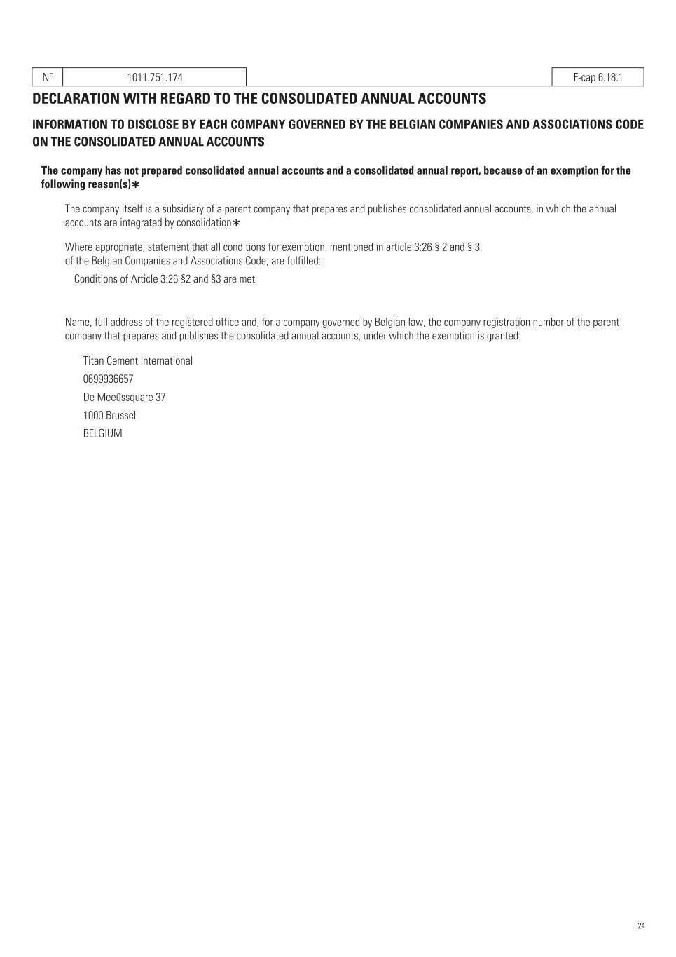 N° 1011.751.174   F-cap 6.18.1 DECLARATION WITH REGARD TO THE CONSOLIDATED ANNUAL ACCOUNTS INFORMATION TO DISCLOSE BY EACH COMPANY GOVERNED BY THE BELGIAN COMPANIES AND ASSOCIATIONS CODE ON THE CONSOLIDATED ANNUAL ACCOUNTS The company has not prepared consolidated annual accounts and a consolidated annual report, because of an exemption for the following reason(s)∗ The company itself is a subsidiary of a parent company that prepares and publishes consolidated annual accounts, in which the annual accounts are integrated by consolidation∗   Where appropriate, statement that all conditions for exemption, mentioned in article 3:26 § 2 and § 3 of the Belgian Companies and Associations Code, are fulfilled:     Conditions of Article 3:26 §2 and §3 are met     Name, full address of the registered office and, for a company governed by Belgian law, the company registration number of the parent company that prepares and publishes the consolidated annual accounts, under which the exemption is granted:   Titan Cement International       0699936657 De Meeûssquare 37 1000 Brussel BELGIUM 24