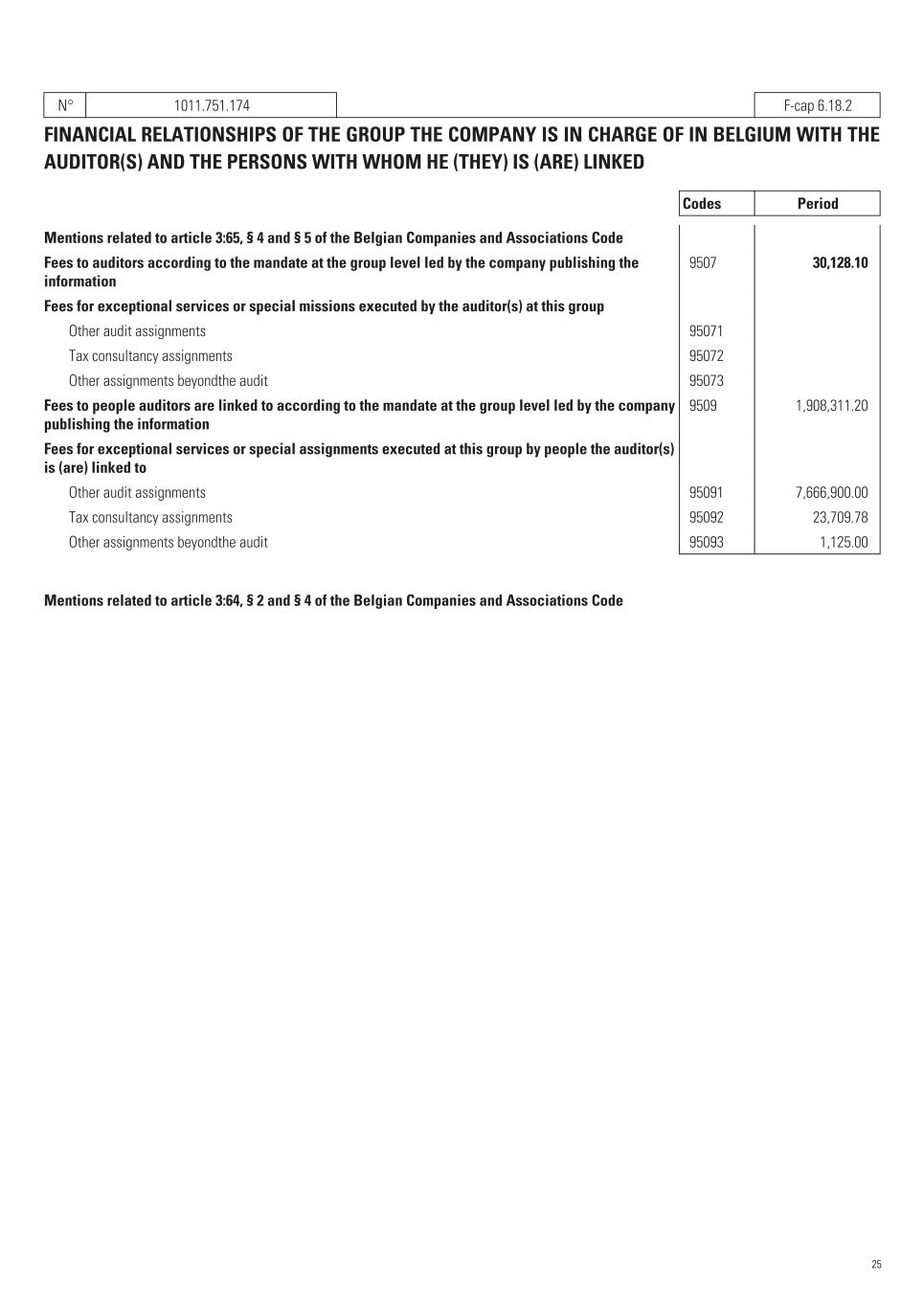N° 1011.751.174   F-cap 6.18.2 FINANCIAL RELATIONSHIPS OF THE GROUP THE COMPANY IS IN CHARGE OF IN BELGIUM WITH THE AUDITOR(S) AND THE PERSONS WITH WHOM HE (THEY) IS (ARE) LINKED Codes Period Mentions related to article 3:65, § 4 and § 5 of the Belgian Companies and Associations Code Fees to auditors according to the mandate at the group level led by the company publishing the information   9507 30,128.10    Fees for exceptional services or special missions executed by the auditor(s) at this group Other audit assignments   95071    Tax consultancy assignments   95072    Other assignments beyondthe audit   95073    Fees to people auditors are linked to according to the mandate at the group level led by the company publishing the information   9509 1,908,311.20    Fees for exceptional services or special assignments executed at this group by people the auditor(s) is (are) linked to Other audit assignments   95091 7,666,900.00    Tax consultancy assignments   95092 23,709.78    Other assignments beyondthe audit   95093 1,125.00    Mentions related to article 3:64, § 2 and § 4 of the Belgian Companies and Associations Code 25