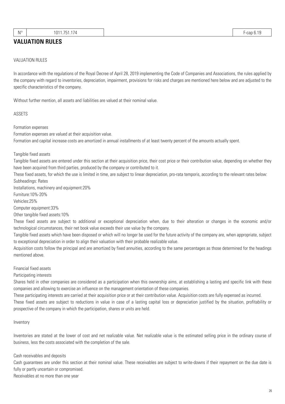 N° 1011.751.174   F-cap 6.19 VALUATION RULES VALUATION RULES In accordance with the regulations of the Royal Decree of April 28, 2019 implementing the Code of Companies and Associations, the rules applied by the company with regard to inventories, depreciation, impairment, provisions for risks and charges are mentioned here below and are adjusted to the specific characteristics of the company. Without further mention, all assets and liabilities are valued at their nominal value. ASSETS Formation expenses Formation expenses are valued at their acquisition value. Formation and capital increase costs are amortized in annual installments of at least twenty percent of the amounts actually spent. Tangible fixed assets Tangible fixed assets are entered under this section at their acquisition price, their cost price or their contribution value, depending on whether they have been acquired from third parties, produced by the company or contributed to it. These fixed assets, for which the use is limited in time, are subject to linear depreciation, pro-rata temporis, according to the relevant rates below: Subheadings: Rates Installations, machinery and equipment:20% Furniture:10%-20% Vehicles:25% Computer equipment:33% Other tangible fixed assets:10% These fixed assets are subject to additional or exceptional depreciation when, due to their alteration or changes in the economic and/or technological circumstances, their net book value exceeds their use value by the company. Tangible fixed assets which have been disposed or which will no longer be used for the future activity of the company are, when appropriate, subject to exceptional depreciation in order to align their valuation with their probable realizable value. Acquisition costs follow the principal and are amortized by fixed annuities, according to the same percentages as those determined for the headings mentioned above. Financial fixed assets Participating interests Shares held in other companies are considered as a participation when this ownership aims, at establishing a lasting and specific link with these companies and allowing to exercise an influence on the management orientation of these companies. These participating interests are carried at their acquisition price or at their contribution value. Acquisition costs are fully expensed as incurred. These fixed assets are subject to reductions in value in case of a lasting capital loss or depreciation justified by the situation, profitability or prospective of the company in which the participation, shares or units are held. Inventory Inventories are stated at the lower of cost and net realizable value. Net realizable value is the estimated selling price in the ordinary course of business, less the costs associated with the completion of the sale. Cash receivables and deposits Cash guarantees are under this section at their nominal value. These receivables are subject to write-downs if their repayment on the due date is fully or partly uncertain or compromised. Receivables at no more than one year 26