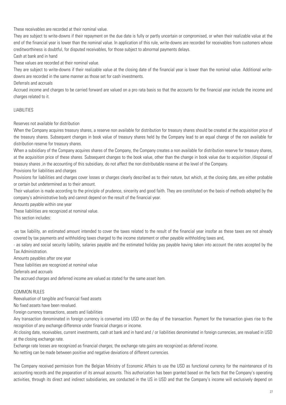 These receivables are recorded at their nominal value. They are subject to write-downs if their repayment on the due date is fully or partly uncertain or compromised, or when their realizable value at the end of the financial year is lower than the nominal value. In application of this rule, write-downs are recorded for receivables from customers whose creditworthiness is doubtful, for disputed receivables, for those subject to abnormal payments delays. Cash at bank and in hand These values are recorded at their nominal value. They are subject to write-downs if their realizable value at the closing date of the financial year is lower than the nominal value. Additional write- downs are recorded in the same manner as those set for cash investments. Deferrals and accruals Accrued income and charges to be carried forward are valued on a pro rata basis so that the accounts for the financial year include the income and charges related to it. LIABILITIES Reserves not available for distribution When the Company acquires treasury shares, a reserve non available for distribution for treasury shares should be created at the acquisition price of the treasury shares. Subsequent changes in book value of treasury shares held by the Company lead to an equal change of the non available for distribution reserve for treasury shares. When a subsidiary of the Company acquires shares of the Company, the Company creates a non available for distribution reserve for treasury shares, at the acquisition price of these shares. Subsequent changes to the book value, other than the change in book value due to acquisition /disposal of treasury shares ,in the accounting of this subsidiary, do not affect the non distributable reserve at the level of the Company. Provisions for liabilities and charges Provisions for liabilities and charges cover losses or charges clearly described as to their nature, but which, at the closing date, are either probable or certain but undetermined as to their amount. Their valuation is made according to the principle of prudence, sincerity and good faith. They are constituted on the basis of methods adopted by the company's administrative body and cannot depend on the result of the financial year. Amounts payable within one year These liabilities are recognized at nominal value. This section includes: -as tax liability, an estimated amount intended to cover the taxes related to the result of the financial year insofar as these taxes are not already covered by tax payments and withholding taxes charged to the income statement or other payable withholding taxes and, - as salary and social security liability, salaries payable and the estimated holiday pay payable having taken into account the rates accepted by the Tax Administration. Amounts payables after one year These liabilities are recognized at nominal value Deferrals and accruals The accrued charges and deferred income are valued as stated for the same asset item. COMMON RULES Reevaluation of tangible and financial fixed assets No fixed assets have been revalued. Foreign currency transactions, assets and liabilities Any transaction denominated in foreign currency is converted into USD on the day of the transaction. Payment for the transaction gives rise to the recognition of any exchange difference under financial charges or income. At closing date, receivables, current investments, cash at bank and in hand and / or liabilities denominated in foreign currencies, are revalued in USD at the closing exchange rate. Exchange rate losses are recognized as financial charges; the exchange rate gains are recognized as deferred income. No netting can be made between positive and negative deviations of different currencies. The Company received permission from the Belgian Ministry of Economic Affairs to use the USD as functional currency for the maintenance of its accounting records and the preparation of its annual accounts. This authorization has been granted based on the facts that the Company’s operating activities, through its direct and indirect subsidiaries, are conducted in the US in USD and that the Company’s income will exclusively depend on 27