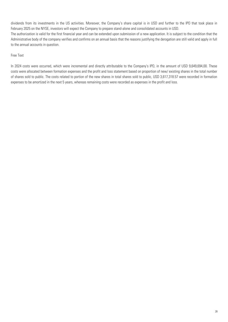 dividends from its investments in the US activities. Moreover, the Company’s share capital is in USD and further to the IPO that took place in February 2025 on the NYSE, investors will expect the Company to prepare stand-alone and consolidated accounts in USD. The authorization is valid for the first financial year and can be extended upon submission of a new application. It is subject to the condition that the Administrative body of the company verifies and confirms on an annual basis that the reasons justifying the derogation are still valid and apply in full to the annual accounts in question. Free Text In 2024 costs were occurred, which were incremental and directly attributable to the Company's IPO, in the amount of USD 9,649,694,00. These costs were allocated between formation expenses and the profit and loss statement based on proportion of new/ existing shares in the total number of shares sold to public. The costs related to portion of the new shares in total shares sold to public, USD 3,617,318.57 were recorded in formation expenses to be amortized in the next 5 years, whereas remaining costs were recorded as expenses in the profit and loss. 28