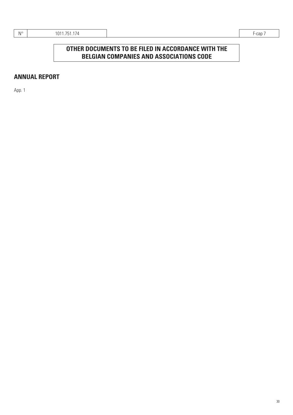 N° 1011.751.174   F-cap 7   OTHER DOCUMENTS TO BE FILED IN ACCORDANCE WITH THE BELGIAN COMPANIES AND ASSOCIATIONS CODE   ANNUAL REPORT App. 1 30