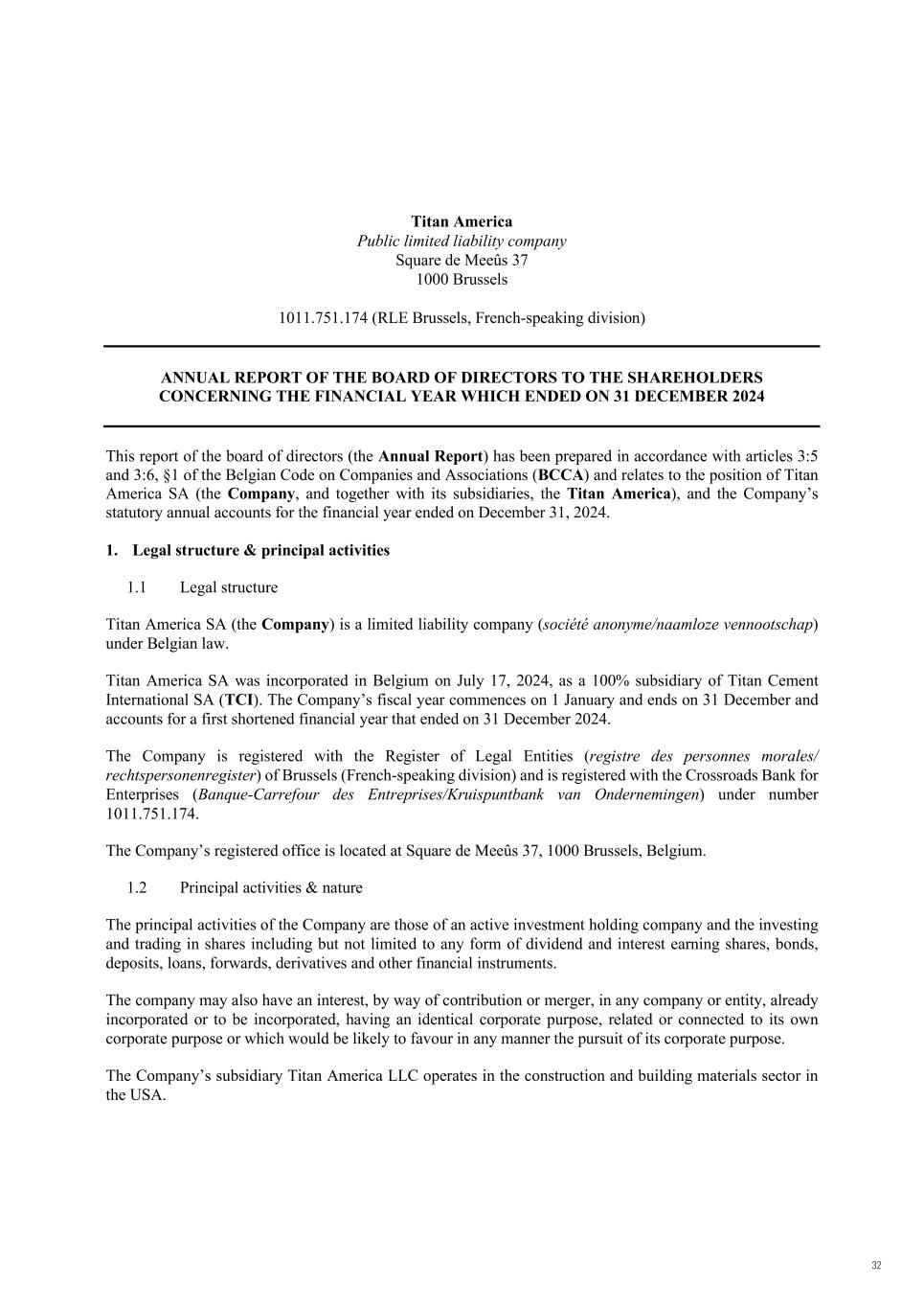 Titan America Public limited liability company Square de Meeûs 37 1000 Brussels 1011.751.174 (RLE Brussels, French-speaking division) ANNUAL REPORT OF THE BOARD OF DIRECTORS TO THE SHAREHOLDERS CONCERNING THE FINANCIAL YEAR WHICH ENDED ON 31 DECEMBER 2024 This report of the board of directors (the Annual Report) has been prepared in accordance with articles 3:5 and 3:6, §1 of the Belgian Code on Companies and Associations (BCCA) and relates to the position of Titan America SA (the Company, and together with its subsidiaries, the Titan America), and the Company’s statutory annual accounts for the financial year ended on December 31, 2024. 1. Legal structure & principal activities 1.1 Legal structure Titan America SA (the Company) is a limited liability company (société anonyme/naamloze vennootschap) under Belgian law. Titan America SA was incorporated in Belgium on July 17, 2024, as a 100% subsidiary of Titan Cement International SA (TCI). The Company’s fiscal year commences on 1 January and ends on 31 December and accounts for a first shortened financial year that ended on 31 December 2024. The Company is registered with the Register of Legal Entities (registre des personnes morales/ rechtspersonenregister) of Brussels (French-speaking division) and is registered with the Crossroads Bank for Enterprises (Banque-Carrefour des Entreprises/Kruispuntbank van Ondernemingen) under number 1011.751.174. The Company’s registered office is located at Square de Meeûs 37, 1000 Brussels, Belgium. 1.2 Principal activities & nature The principal activities of the Company are those of an active investment holding company and the investing and trading in shares including but not limited to any form of dividend and interest earning shares, bonds, deposits, loans, forwards, derivatives and other financial instruments. The company may also have an interest, by way of contribution or merger, in any company or entity, already incorporated or to be incorporated, having an identical corporate purpose, related or connected to its own corporate purpose or which would be likely to favour in any manner the pursuit of its corporate purpose. The Company’s subsidiary Titan America LLC operates in the construction and building materials sector in the USA. 32