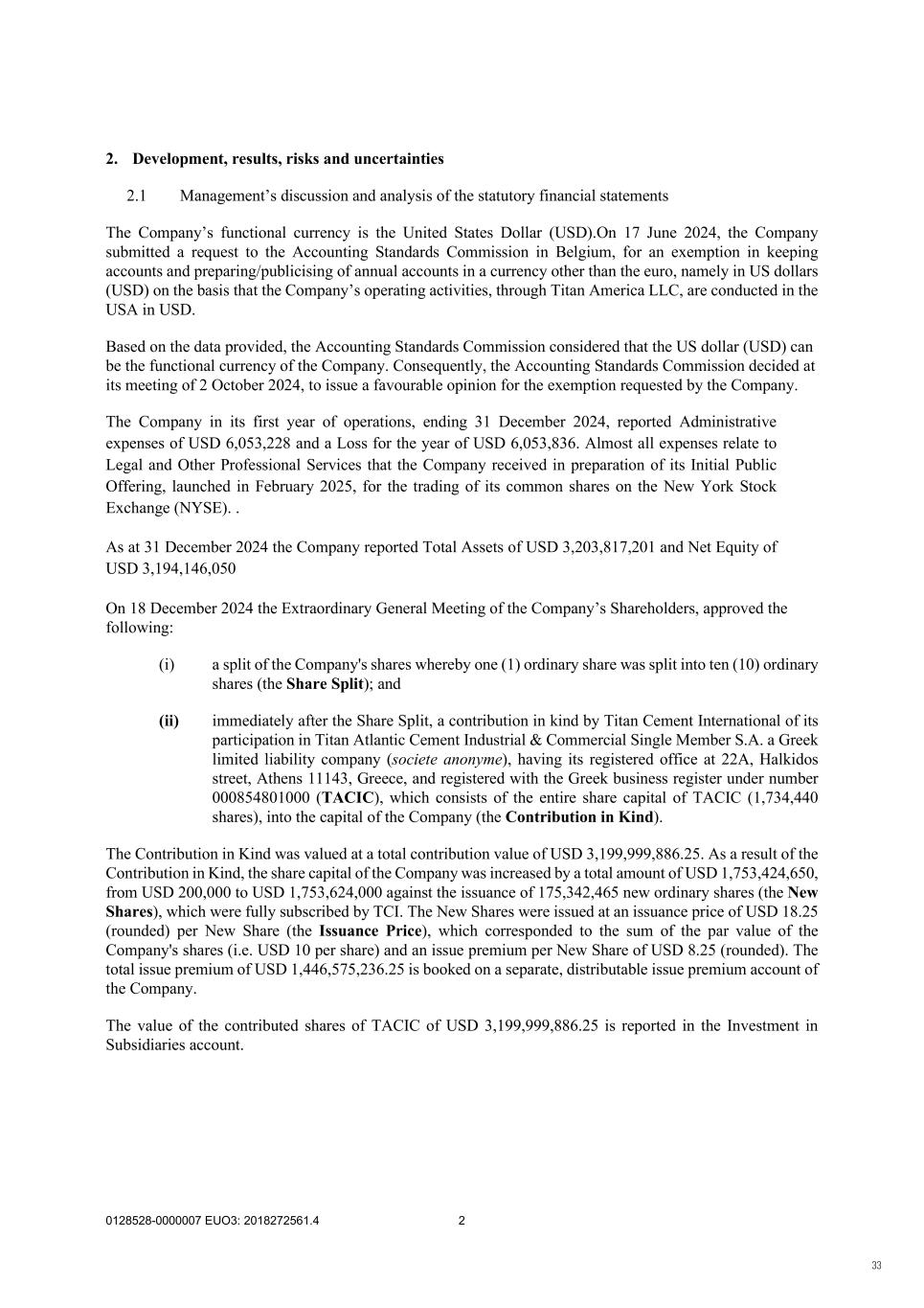 0128528-0000007 EUO3: 2018272561.4 2 2. Development, results, risks and uncertainties 2.1 Management’s discussion and analysis of the statutory financial statements The Company’s functional currency is the United States Dollar (USD).On 17 June 2024, the Company submitted a request to the Accounting Standards Commission in Belgium, for an exemption in keeping accounts and preparing/publicising of annual accounts in a currency other than the euro, namely in US dollars (USD) on the basis that the Company’s operating activities, through Titan America LLC, are conducted in the USA in USD. Based on the data provided, the Accounting Standards Commission considered that the US dollar (USD) can be the functional currency of the Company. Consequently, the Accounting Standards Commission decided at its meeting of 2 October 2024, to issue a favourable opinion for the exemption requested by the Company. The Company in its first year of operations, ending 31 December 2024, reported Administrative expenses of USD 6,053,228 and a Loss for the year of USD 6,053,836. Almost all expenses relate to Legal and Other Professional Services that the Company received in preparation of its Initial Public Offering, launched in February 2025, for the trading of its common shares on the New York Stock Exchange (NYSE). . As at 31 December 2024 the Company reported Total Assets of USD 3,203,817,201 and Net Equity of USD 3,194,146,050 On 18 December 2024 the Extraordinary General Meeting of the Company’s Shareholders, approved the following: (i) a split of the Company's shares whereby one (1) ordinary share was split into ten (10) ordinary shares (the Share Split); and (ii) immediately after the Share Split, a contribution in kind by Titan Cement International of its participation in Titan Atlantic Cement Industrial & Commercial Single Member S.A. a Greek limited liability company (societe anonyme), having its registered office at 22A, Halkidos street, Athens 11143, Greece, and registered with the Greek business register under number 000854801000 (TACIC), which consists of the entire share capital of TACIC (1,734,440 shares), into the capital of the Company (the Contribution in Kind). The Contribution in Kind was valued at a total contribution value of USD 3,199,999,886.25. As a result of the Contribution in Kind, the share capital of the Company was increased by a total amount of USD 1,753,424,650, from USD 200,000 to USD 1,753,624,000 against the issuance of 175,342,465 new ordinary shares (the New Shares), which were fully subscribed by TCI. The New Shares were issued at an issuance price of USD 18.25 (rounded) per New Share (the Issuance Price), which corresponded to the sum of the par value of the Company's shares (i.e. USD 10 per share) and an issue premium per New Share of USD 8.25 (rounded). The total issue premium of USD 1,446,575,236.25 is booked on a separate, distributable issue premium account of the Company. The value of the contributed shares of TACIC of USD 3,199,999,886.25 is reported in the Investment in Subsidiaries account. 33