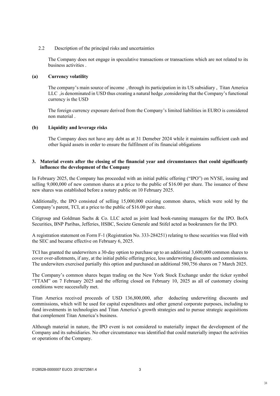 0128528-0000007 EUO3: 2018272561.4 3 2.2 Description of the principal risks and uncertainties The Company does not engage in speculative transactions or transactions which are not related to its business activities . (a) Currency volatility The company’s main source of income , through its participation in its US subsidiary , Titan America LLC ,is denominated in USD thus creating a natural hedge ,considering that the Company’s functional currency is the USD The foreign currency exposure derived from the Company’s limited liabilities in EURO is considered non material . (b) Liquidity and leverage risks The Company does not have any debt as at 31 Demeber 2024 while it maintains sufficient cash and other liquid assets in order to ensure the fulfilment of its financial obligations 3. Material events after the closing of the financial year and circumstances that could significantly influence the development of the Company In February 2025, the Company has proceeded with an initial public offering (“IPO”) on NYSE, issuing and selling 9,000,000 of new common shares at a price to the public of $16.00 per share. The issuance of these new shares was established before a notary public on 10 February 2025. Additionally, the IPO consisted of selling 15,000,000 existing common shares, which were sold by the Company’s parent, TCI, at a price to the public of $16.00 per share. Citigroup and Goldman Sachs & Co. LLC acted as joint lead book-running managers for the IPO. BofA Securities, BNP Paribas, Jefferies, HSBC, Societe Generale and Stifel acted as bookrunners for the IPO. A registration statement on Form F-1 (Registration No. 333-284251) relating to these securities was filed with the SEC and became effective on February 6, 2025. TCI has granted the underwriters a 30-day option to purchase up to an additional 3,600,000 common shares to cover over-allotments, if any, at the initial public offering price, less underwriting discounts and commissions. The underwiters exercised partially this option and purchased an additional 580,756 shares on 7 March 2025. The Company’s common shares began trading on the New York Stock Exchange under the ticker symbol “TTAM” on 7 February 2025 and the offering closed on February 10, 2025 as all of customary closing conditions were successfully met. Titan America received proceeds of USD 136,800,000, after deducting underwriting discounts and commissions, which will be used for capital expenditures and other general corporate purposes, including to fund investments in technologies and Titan America’s growth strategies and to pursue strategic acquisitions that complement Titan America’s business. Although material in nature, the IPO event is not considered to materially impact the development of the Company and its subsidiaries. No other circumstance was identified that could materially impact the activities or operations of the Company. 34