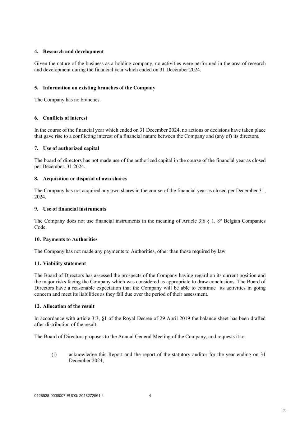 0128528-0000007 EUO3: 2018272561.4 4 4. Research and development Given the nature of the business as a holding company, no activities were performed in the area of research and development during the financial year which ended on 31 December 2024. 5. Information on existing branches of the Company The Company has no branches. 6. Conflicts of interest In the course of the financial year which ended on 31 December 2024, no actions or decisions have taken place that gave rise to a conflicting interest of a financial nature between the Company and (any of) its directors. 7. Use of authorized capital The board of directors has not made use of the authorized capital in the course of the financial year as closed per December, 31 2024. 8. Acquisition or disposal of own shares The Company has not acquired any own shares in the course of the financial year as closed per December 31, 2024. 9. Use of financial instruments The Company does not use financial instruments in the meaning of Article 3:6 § 1, 8° Belgian Companies Code. 10. Payments to Authorities The Company has not made any payments to Authorities, other than those required by law. 11. Viability statement The Board of Directors has assessed the prospects of the Company having regard on its current position and the major risks facing the Company which was considered as appropriate to draw conclusions. The Board of Directors have a reasonable expectation that the Company will be able to continue its activities in going concern and meet its liabilities as they fall due over the period of their assessment. 12. Allocation of the result In accordance with article 3:3, §1 of the Royal Decree of 29 April 2019 the balance sheet has been drafted after distribution of the result. The Board of Directors proposes to the Annual General Meeting of the Company, and requests it to: (i) acknowledge this Report and the report of the statutory auditor for the year ending on 31 December 2024; 35
