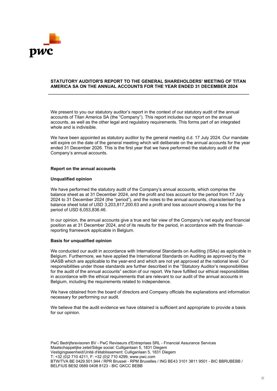 PwC Bedrijfsrevisoren BV - PwC Reviseurs d'Entreprises SRL - Financial Assurance Services Maatschappelijke zetel/Siège social: Culliganlaan 5, 1831 Diegem Vestigingseenheid/Unité d'établissement: Culliganlaan 5, 1831 Diegem T: +32 (0)2 710 4211, F: +32 (0)2 710 4299, www.pwc.com BTW/TVA BE 0429.501.944 / RPR Brussel - RPM Bruxelles / ING BE43 3101 3811 9501 - BIC BBRUBEBB / BELFIUS BE92 0689 0408 8123 - BIC GKCC BEBB STATUTORY AUDITOR'S REPORT TO THE GENERAL SHAREHOLDERS’ MEETING OF TITAN AMERICA SA ON THE ANNUAL ACCOUNTS FOR THE YEAR ENDED 31 DECEMBER 2024 We present to you our statutory auditor’s report in the context of our statutory audit of the annual accounts of Titan America SA (the “Company”). This report includes our report on the annual accounts, as well as the other legal and regulatory requirements. This forms part of an integrated whole and is indivisible. We have been appointed as statutory auditor by the general meeting d.d. 17 July 2024. Our mandate will expire on the date of the general meeting which will deliberate on the annual accounts for the year ended 31 December 2026. This is the first year that we have performed the statutory audit of the Company’s annual accounts. Report on the annual accounts Unqualified opinion We have performed the statutory audit of the Company’s annual accounts, which comprise the balance sheet as at 31 December 2024, and the profit and loss account for the period from 17 July 2024 to 31 December 2024 (the “period”), and the notes to the annual accounts, characterised by a balance sheet total of USD 3,203,817,200.63 and a profit and loss account showing a loss for the period of USD 6,053,836.46. In our opinion, the annual accounts give a true and fair view of the Company’s net equity and financial position as at 31 December 2024, and of its results for the period, in accordance with the financial- reporting framework applicable in Belgium. Basis for unqualified opinion We conducted our audit in accordance with International Standards on Auditing (ISAs) as applicable in Belgium. Furthermore, we have applied the International Standards on Auditing as approved by the IAASB which are applicable to the year-end and which are not yet approved at the national level. Our responsibilities under those standards are further described in the “Statutory Auditor’s responsibilities for the audit of the annual accounts” section of our report. We have fulfilled our ethical responsibilities in accordance with the ethical requirements that are relevant to our audit of the annual accounts in Belgium, including the requirements related to independence. We have obtained from the board of directors and Company officials the explanations and information necessary for performing our audit. We believe that the audit evidence we have obtained is sufficient and appropriate to provide a basis for our opinion. 37