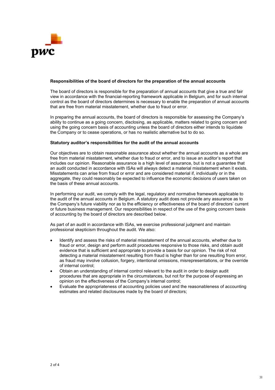 2 of 4 Responsibilities of the board of directors for the preparation of the annual accounts The board of directors is responsible for the preparation of annual accounts that give a true and fair view in accordance with the financial-reporting framework applicable in Belgium, and for such internal control as the board of directors determines is necessary to enable the preparation of annual accounts that are free from material misstatement, whether due to fraud or error. In preparing the annual accounts, the board of directors is responsible for assessing the Company’s ability to continue as a going concern, disclosing, as applicable, matters related to going concern and using the going concern basis of accounting unless the board of directors either intends to liquidate the Company or to cease operations, or has no realistic alternative but to do so. Statutory auditor’s responsibilities for the audit of the annual accounts Our objectives are to obtain reasonable assurance about whether the annual accounts as a whole are free from material misstatement, whether due to fraud or error, and to issue an auditor’s report that includes our opinion. Reasonable assurance is a high level of assurance, but is not a guarantee that an audit conducted in accordance with ISAs will always detect a material misstatement when it exists. Misstatements can arise from fraud or error and are considered material if, individually or in the aggregate, they could reasonably be expected to influence the economic decisions of users taken on the basis of these annual accounts. In performing our audit, we comply with the legal, regulatory and normative framework applicable to the audit of the annual accounts in Belgium. A statutory audit does not provide any assurance as to the Company’s future viability nor as to the efficiency or effectiveness of the board of directors’ current or future business management. Our responsibilities in respect of the use of the going concern basis of accounting by the board of directors are described below. As part of an audit in accordance with ISAs, we exercise professional judgment and maintain professional skepticism throughout the audit. We also:  Identify and assess the risks of material misstatement of the annual accounts, whether due to fraud or error, design and perform audit procedures responsive to those risks, and obtain audit evidence that is sufficient and appropriate to provide a basis for our opinion. The risk of not detecting a material misstatement resulting from fraud is higher than for one resulting from error, as fraud may involve collusion, forgery, intentional omissions, misrepresentations, or the override of internal control;  Obtain an understanding of internal control relevant to the audit in order to design audit procedures that are appropriate in the circumstances, but not for the purpose of expressing an opinion on the effectiveness of the Company’s internal control;  Evaluate the appropriateness of accounting policies used and the reasonableness of accounting estimates and related disclosures made by the board of directors; 38