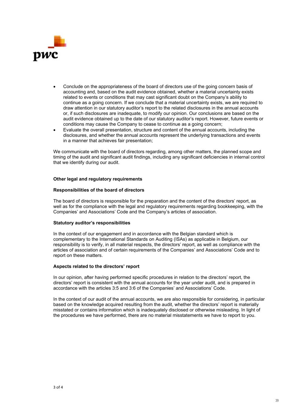 3 of 4  Conclude on the appropriateness of the board of directors use of the going concern basis of accounting and, based on the audit evidence obtained, whether a material uncertainty exists related to events or conditions that may cast significant doubt on the Company’s ability to continue as a going concern. If we conclude that a material uncertainty exists, we are required to draw attention in our statutory auditor’s report to the related disclosures in the annual accounts or, if such disclosures are inadequate, to modify our opinion. Our conclusions are based on the audit evidence obtained up to the date of our statutory auditor’s report. However, future events or conditions may cause the Company to cease to continue as a going concern;  Evaluate the overall presentation, structure and content of the annual accounts, including the disclosures, and whether the annual accounts represent the underlying transactions and events in a manner that achieves fair presentation; We communicate with the board of directors regarding, among other matters, the planned scope and timing of the audit and significant audit findings, including any significant deficiencies in internal control that we identify during our audit. Other legal and regulatory requirements Responsibilities of the board of directors The board of directors is responsible for the preparation and the content of the directors’ report, as well as for the compliance with the legal and regulatory requirements regarding bookkeeping, with the Companies’ and Associations’ Code and the Company’s articles of association. Statutory auditor’s responsibilities In the context of our engagement and in accordance with the Belgian standard which is complementary to the International Standards on Auditing (ISAs) as applicable in Belgium, our responsibility is to verify, in all material respects, the directors’ report, as well as compliance with the articles of association and of certain requirements of the Companies’ and Associations’ Code and to report on these matters. Aspects related to the directors’ report In our opinion, after having performed specific procedures in relation to the directors’ report, the directors’ report is consistent with the annual accounts for the year under audit, and is prepared in accordance with the articles 3:5 and 3:6 of the Companies’ and Associations’ Code. In the context of our audit of the annual accounts, we are also responsible for considering, in particular based on the knowledge acquired resulting from the audit, whether the directors’ report is materially misstated or contains information which is inadequately disclosed or otherwise misleading. In light of the procedures we have performed, there are no material misstatements we have to report to you. 39