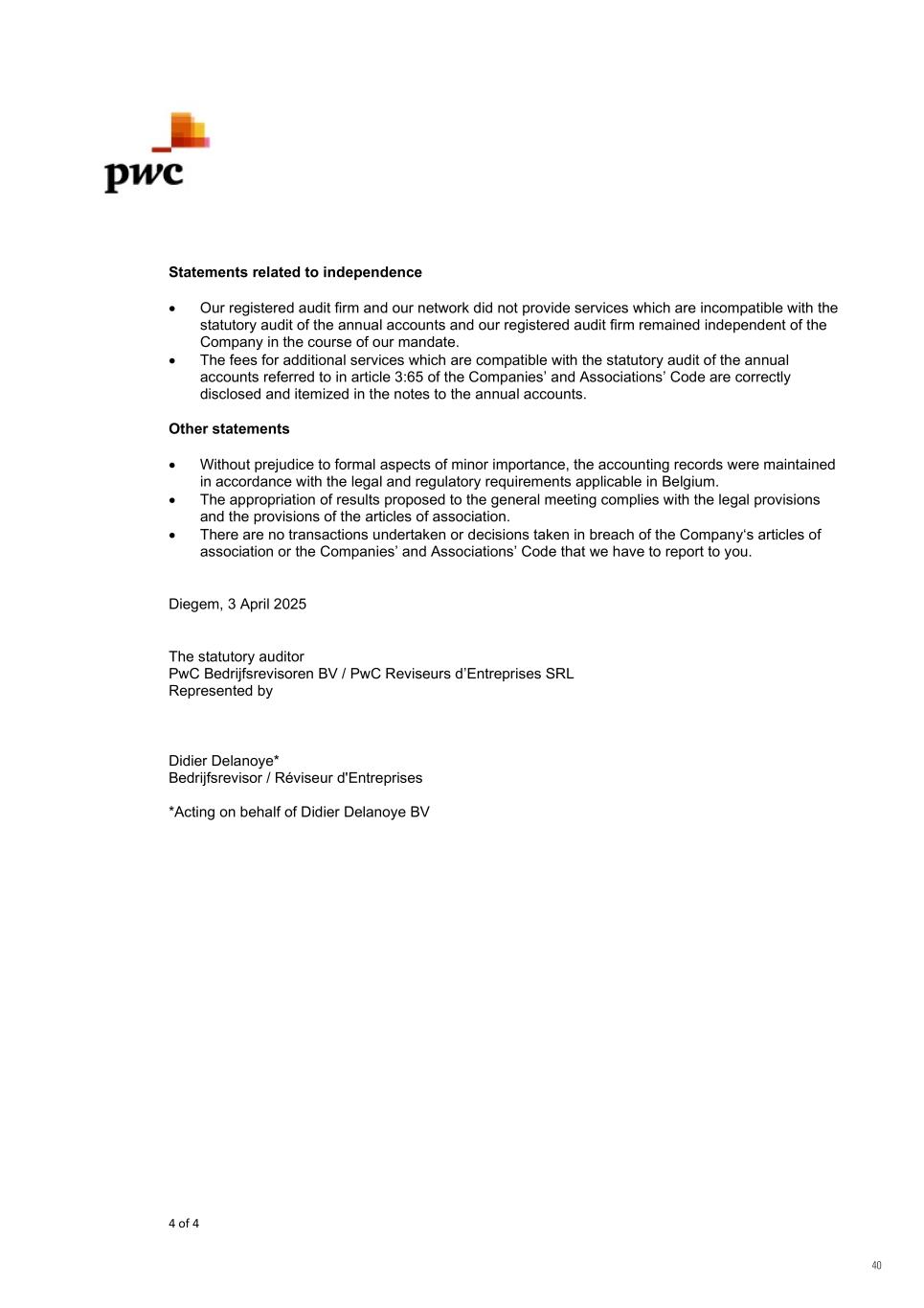 4 of 4 Statements related to independence  Our registered audit firm and our network did not provide services which are incompatible with the statutory audit of the annual accounts and our registered audit firm remained independent of the Company in the course of our mandate.  The fees for additional services which are compatible with the statutory audit of the annual accounts referred to in article 3:65 of the Companies’ and Associations’ Code are correctly disclosed and itemized in the notes to the annual accounts. Other statements  Without prejudice to formal aspects of minor importance, the accounting records were maintained in accordance with the legal and regulatory requirements applicable in Belgium.  The appropriation of results proposed to the general meeting complies with the legal provisions and the provisions of the articles of association.  There are no transactions undertaken or decisions taken in breach of the Company‘s articles of association or the Companies’ and Associations’ Code that we have to report to you. Diegem, 3 April 2025 The statutory auditor PwC Bedrijfsrevisoren BV / PwC Reviseurs d’Entreprises SRL Represented by Didier Delanoye* Bedrijfsrevisor / Réviseur d'Entreprises *Acting on behalf of Didier Delanoye BV 40