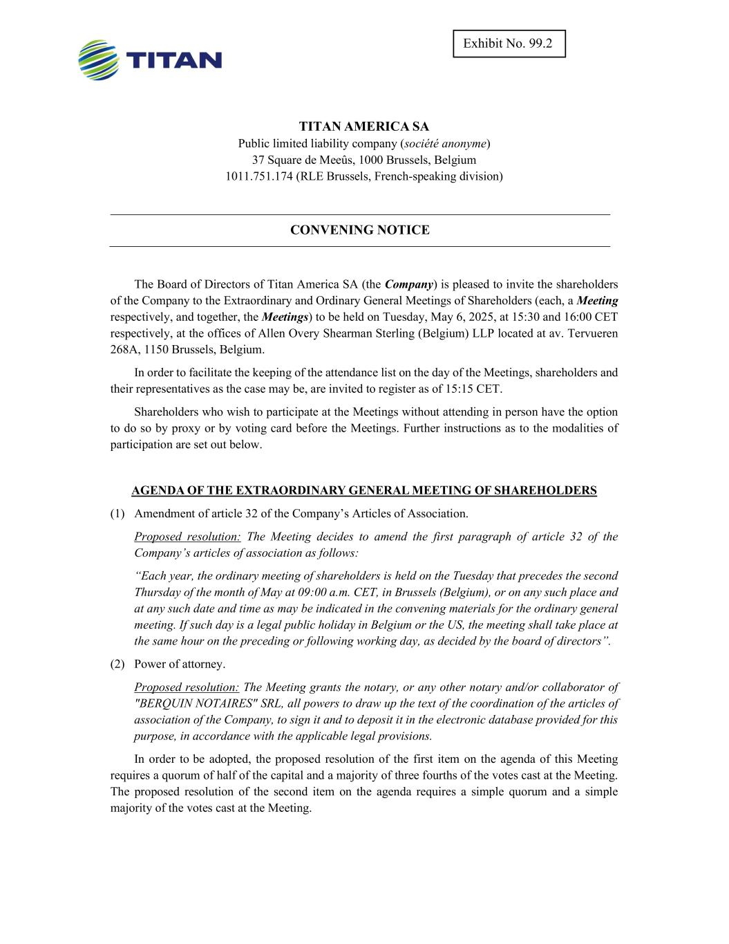 TITAN AMERICA SA Public limited liability company (société anonyme) 37 Square de Meeûs, 1000 Brussels, Belgium 1011.751.174 (RLE Brussels, French-speaking division) CONVENING NOTICE The Board of Directors of Titan America SA (the Company) is pleased to invite the shareholders of the Company to the Extraordinary and Ordinary General Meetings of Shareholders (each, a Meeting respectively, and together, the Meetings) to be held on Tuesday, May 6, 2025, at 15:30 and 16:00 CET respectively, at the offices of Allen Overy Shearman Sterling (Belgium) LLP located at av. Tervueren 268A, 1150 Brussels, Belgium. In order to facilitate the keeping of the attendance list on the day of the Meetings, shareholders and their representatives as the case may be, are invited to register as of 15:15 CET. Shareholders who wish to participate at the Meetings without attending in person have the option to do so by proxy or by voting card before the Meetings. Further instructions as to the modalities of participation are set out below. AGENDA OF THE EXTRAORDINARY GENERAL MEETING OF SHAREHOLDERS (1) Amendment of article 32 of the Company’s Articles of Association. Proposed resolution: The Meeting decides to amend the first paragraph of article 32 of the Company’s articles of association as follows: “Each year, the ordinary meeting of shareholders is held on the Tuesday that precedes the second Thursday of the month of May at 09:00 a.m. CET, in Brussels (Belgium), or on any such place and at any such date and time as may be indicated in the convening materials for the ordinary general meeting. If such day is a legal public holiday in Belgium or the US, the meeting shall take place at the same hour on the preceding or following working day, as decided by the board of directors”. (2) Power of attorney. Proposed resolution: The Meeting grants the notary, or any other notary and/or collaborator of "BERQUIN NOTAIRES" SRL, all powers to draw up the text of the coordination of the articles of association of the Company, to sign it and to deposit it in the electronic database provided for this purpose, in accordance with the applicable legal provisions. In order to be adopted, the proposed resolution of the first item on the agenda of this Meeting requires a quorum of half of the capital and a majority of three fourths of the votes cast at the Meeting. The proposed resolution of the second item on the agenda requires a simple quorum and a simple majority of the votes cast at the Meeting. Exhibit No. 99.2